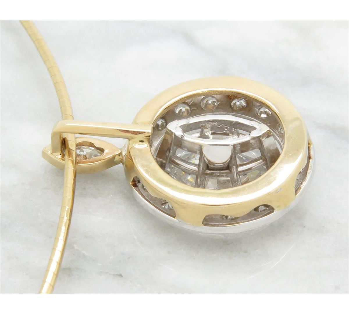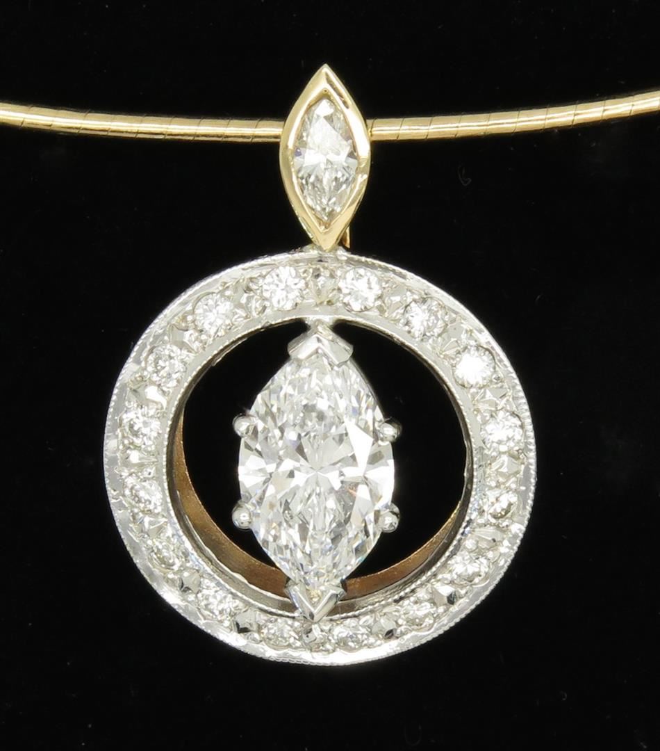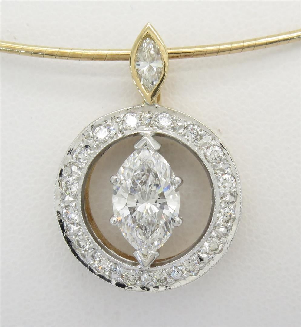 One tested 14K gold diamond pendant. Containing: One Marquise Cut Diamond. Approximate size: 2.01CT. Clarity: SI1, Color: F-G. 16 Round Brilliant Cut Diamonds, 1 Marquise Cut Diamond. Approximate total diamond weight: 2.71CTW. Diamonds are graded in the mounting, unless otherwise stated. Weight: 11.8 grams, Size of chain: 18".