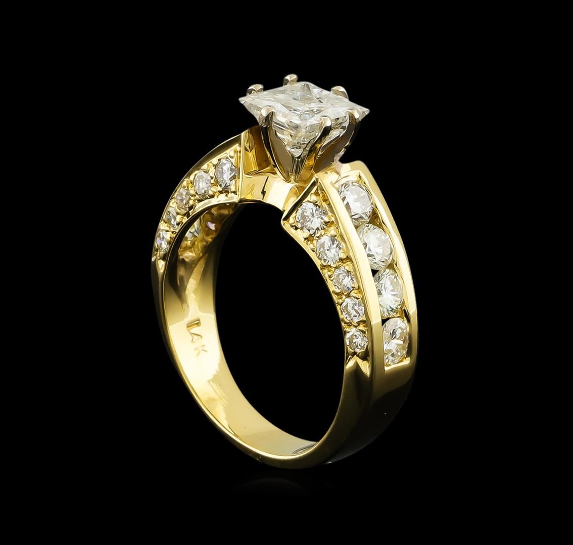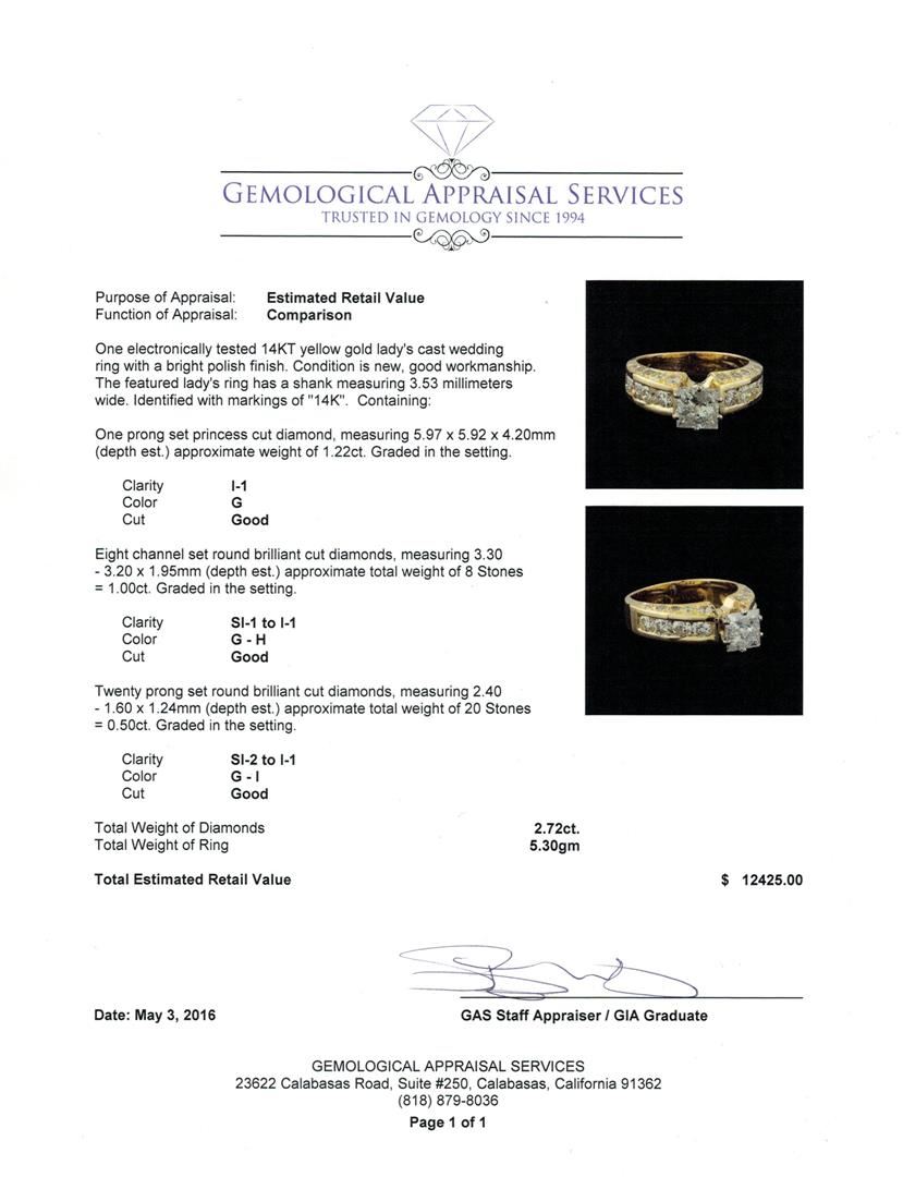 One electronically tested 14KT yellow gold lady's cast wedding ring with a bright polish finish. The featured lady's ring has a shank measuring 3.53 millimeters wide. Identified with markings of "14K". Condition is new, good workmanship. Containing: One prong set princess cut diamond, measuring 5.97 x 5.92 x 4.20mm (depth est.) approximate weight of 1.22ct. Graded in the setting. Clarity: I-1. Color: Good Eight channel set round brilliant cut diamonds, measuring 3.30 - 3.20 x 1.95mm (depth est.) approximate total weight of 8 Stones = 1.00ct. Graded in the setting. Clarity: SI-1 to I-1. Color: G - Good Twenty prong set round brilliant cut diamonds, measuring 2.40 - 1.60 x 1.24mm (depth est.) approximate total weight of 20 Stones = 0.50ct. Graded in the setting. Clarity: SI-2 to I-1. Color: G - I. Cut Good. Total Weight of Diamonds 2.72ct. Total Weight of Ring 5.30gm GAS Appraised at $12,425.00.