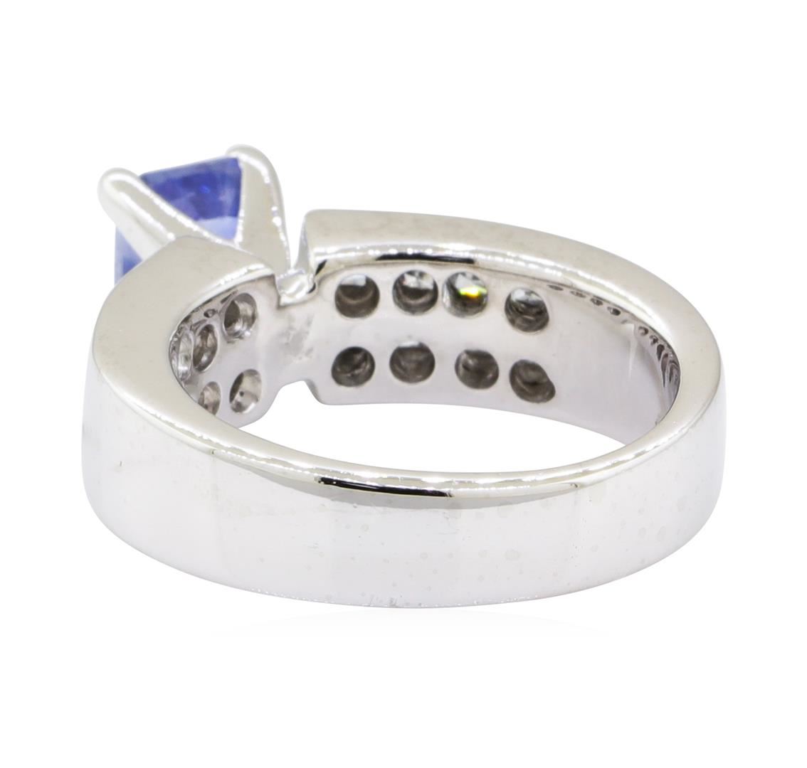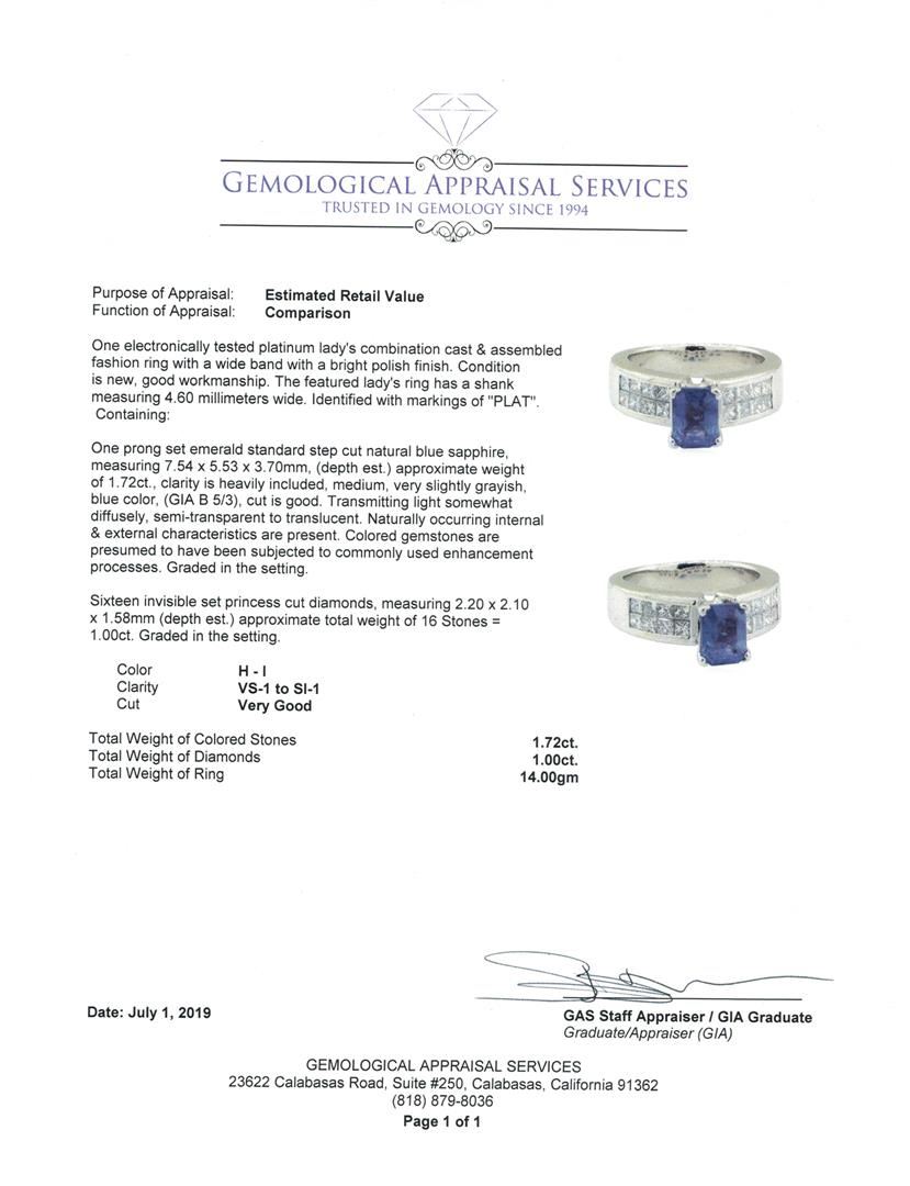 One electronically tested platinum lady's combination cast & assembled fashion ring with a wide band with a bright polish finish. The featured lady's ring has a shank measuring 4.60 millimeters wide. Identified with markings of 'PLAT'. Condition is new, good workmanship. Containing: One prong set emerald standard step cut natural blue sapphire, measuring 7.54 x 5.53 x 3.70mm, (depth est.) approximate weight of 1.72ct., clarity is heavily included, medium, very slightly grayish, blue color, (GIA B 5/3), cut is good. Transmitting light somewhat diffusely, semi-transparent to translucent. Naturally occurring internal & external characteristics are present. Colored gemstones are presumed to have been subjected to commonly used enhancement processes. Graded in the setting. Sixteen invisible set princess cut diamonds, measuring 2.20 x 2.10 x 1.58mm (depth est.) approximate total weight of 16 Stones = 1.00ct. Graded in the setting. Color H - I Clarity VS-1 to SI-1 Cut Very Good. Total Weight of Colored Stones 1.72ct.. Total Weight of Diamonds 1.00ct.. Total Weight of Ring 14.00gm GAS Appraised at $5505.00. GAS Appraised.