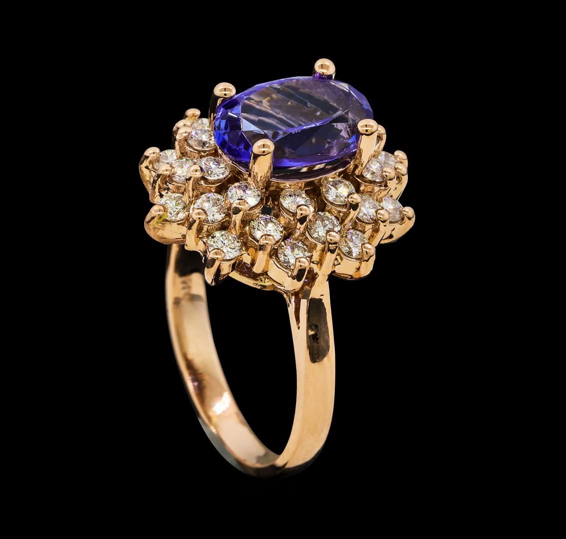 One electronically tested 14KT rose gold lady's cast fashion ring with a staggered basket halo with a bright polish finish. The featured lady's ring has a shank measuring 2.55 millimeters wide. Identified with markings of 'K14'. Condition is new, good workmanship. Containing: One prong set oval modified brilliant cut natural tanzanite, measuring 10.40 x 7.08 x 4.37mm, (depth est.) 20%. bulge factor, approximate weight of 2.72ct., clarity is eye clean, medium, moderately strong, violetish blue color, (GIA vB 5/4), cut is good. Transmitting light with no distortion, transparent. Colored gemstones are presumed to have been subjected to commonly used enhancement processes. Graded in the setting. Thirty prong set round brilliant cut diamonds, measuring 2.10 - 2.05 x 1.29mm (depth est.) approximate total weight of 30 Stones = 1.01ct. Graded in the setting. Clarity SI-1 to SI-2. Color: H - I Cut Good. Total Weight of Colored Stones 2.72ct.. Total Weight of Diamonds 1.01ct.. Total Weight of Ring 6.40gm. GAS Appraised at $7,040.00.