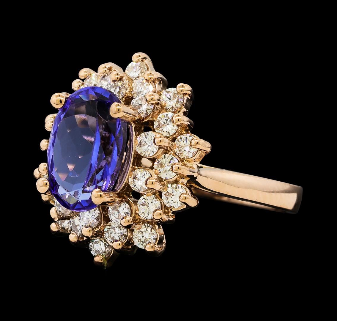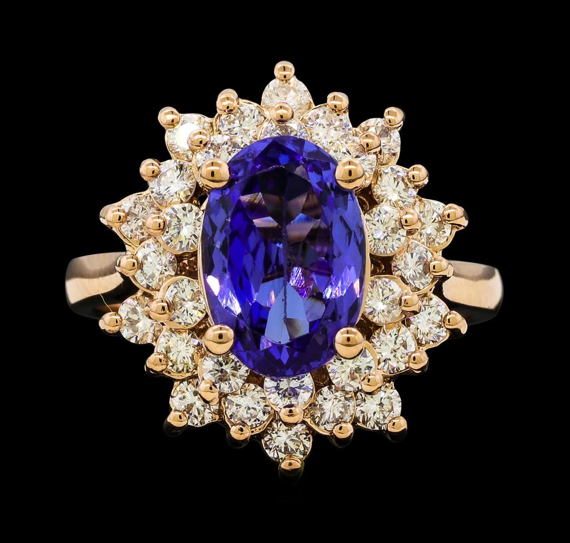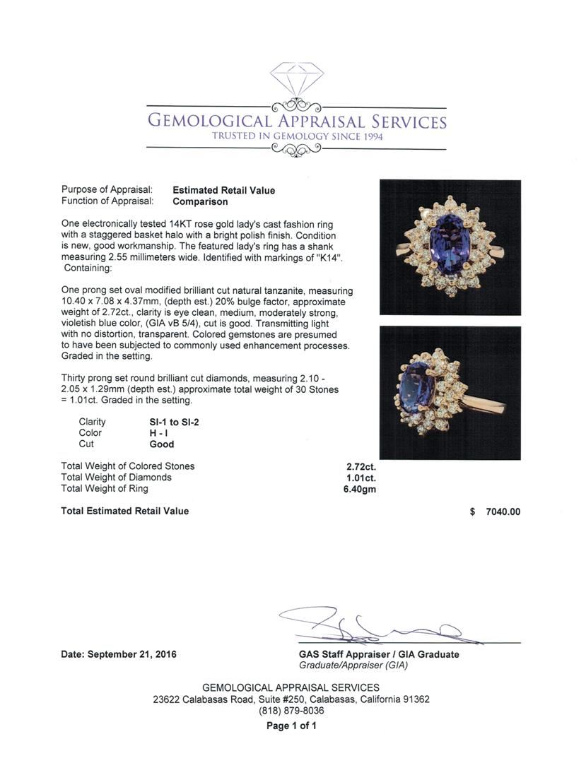 One electronically tested 14KT rose gold lady's cast fashion ring with a staggered basket halo with a bright polish finish. The featured lady's ring has a shank measuring 2.55 millimeters wide. Identified with markings of 'K14'. Condition is new, good workmanship. Containing: One prong set oval modified brilliant cut natural tanzanite, measuring 10.40 x 7.08 x 4.37mm, (depth est.) 20%. bulge factor, approximate weight of 2.72ct., clarity is eye clean, medium, moderately strong, violetish blue color, (GIA vB 5/4), cut is good. Transmitting light with no distortion, transparent. Colored gemstones are presumed to have been subjected to commonly used enhancement processes. Graded in the setting. Thirty prong set round brilliant cut diamonds, measuring 2.10 - 2.05 x 1.29mm (depth est.) approximate total weight of 30 Stones = 1.01ct. Graded in the setting. Clarity SI-1 to SI-2. Color: H - I Cut Good. Total Weight of Colored Stones 2.72ct.. Total Weight of Diamonds 1.01ct.. Total Weight of Ring 6.40gm. GAS Appraised at $7,040.00.