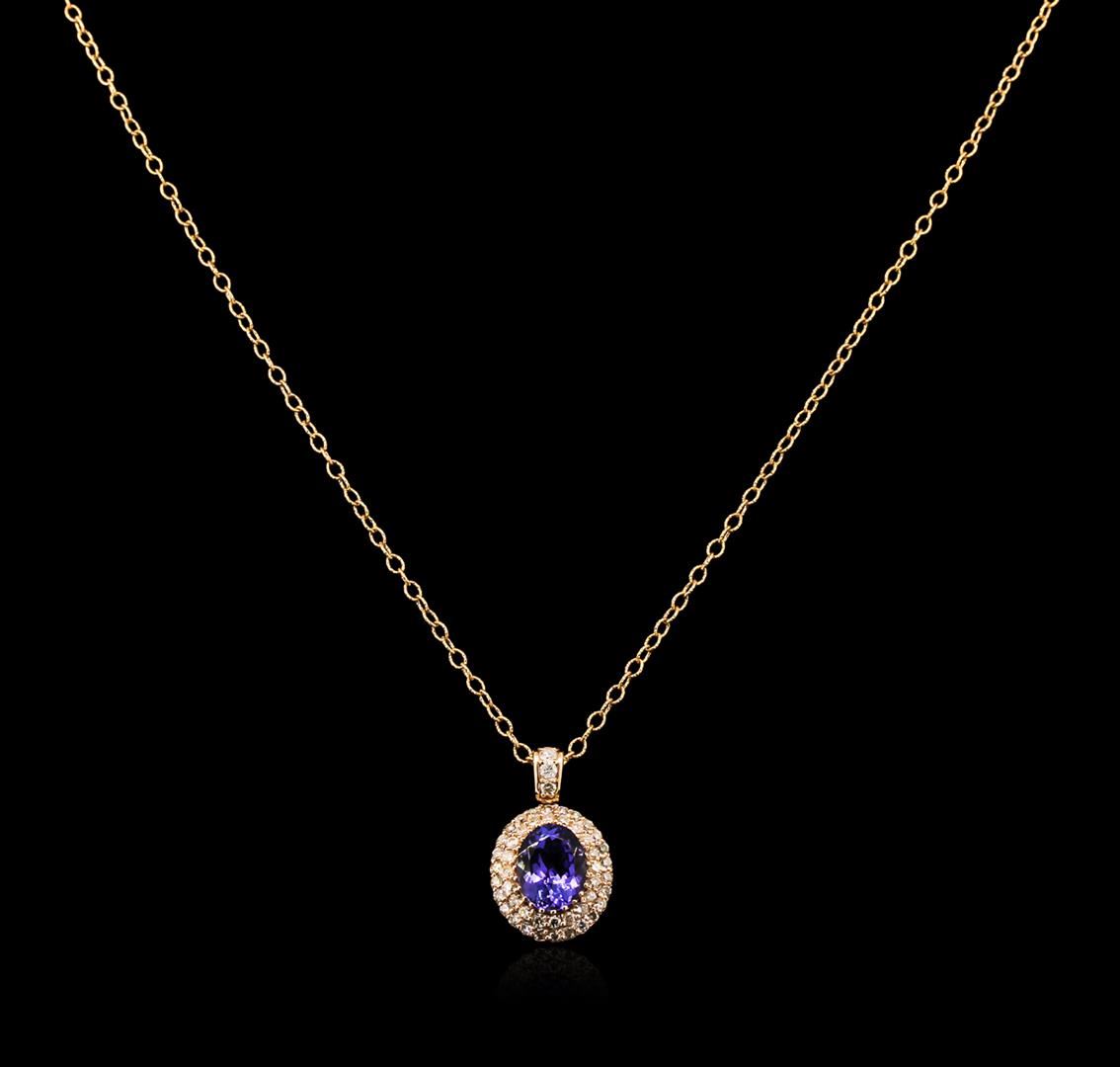 One electronically tested 14KT rose gold lady's cast fashion pendant & chain 18.0" long, 1.7mm fancy cable link with a lobster claw clasp with a bright polish finish. Identified with markings of "14K". Condition is new, good workmanship. Containing: One prong set oval modified brilliant cut natural tanzanite, measuring 10.10 x 7.70 x 5.07mm, approximate weight of 2.72ct., clarity is eye clean, type I, medium, very slightly grayish, bluish violet color, (GIA bV 5/3), cut is good. Transmitting light with no distortion, transparent. Colored gemstones are presumed to have been subjected to commonly used enhancement processes. Graded in the setting. Three prong set round brilliant cut diamonds, measuring 2.00 - 1.95 x 1.19mm (depth est.) approximate total weight of 3 Stones = 0.08ct. Graded in the setting. Clarity: SI-2 to I-1. Color: H - I. Cut Good Forty-Six prong set round brilliant cut diamonds, measuring 1.50 - 1.45 x 0.96mm (depth est.) approximate total weight of 46 Stones = 0.63ct. Graded in the setting. Clarity: SI-2 to I-1. Color: H - I. Cut Good. Total Weight of Colored Stones 2.72ct. Total Weight of Diamonds 0.71ct. Total Weight of Pendant & Chain 5.60gm. GAS Appraised at $5,465.00.