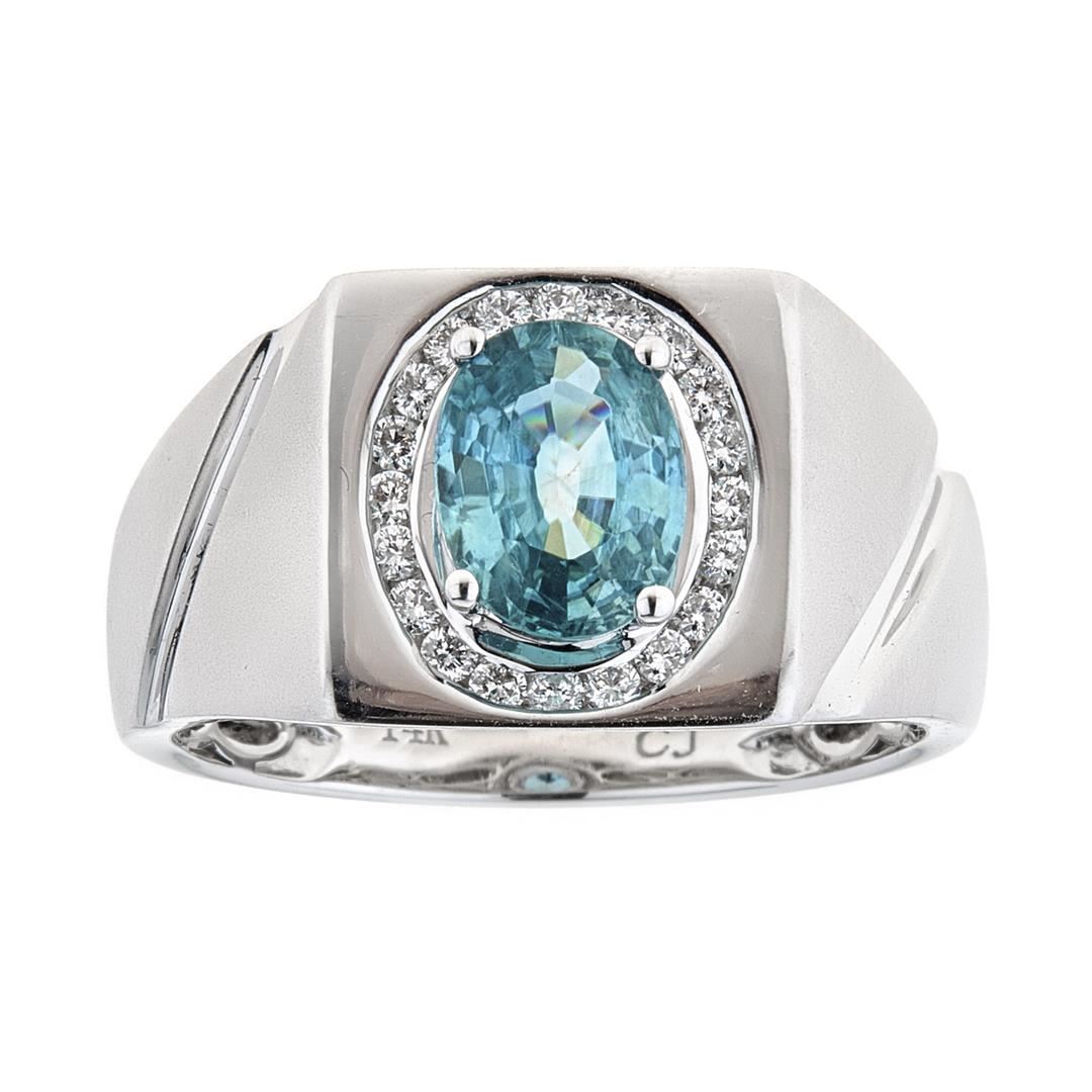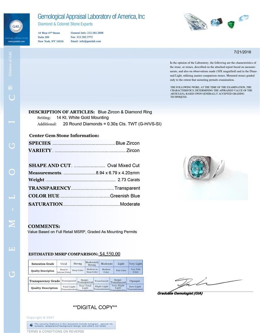 One Blue Zircon and Diamond Ring. Setting: 14 Kt. White Gold Mounting. Additional: 20 Round Diamonds = 0.30 Cts. TWT (G-H/VS-SI). Center Gem Stone Information: Species: Blue Zircon. Variety: Zircon. Shape and Cut: Oval Mixed Cut. Measurements: 8.94 x 6.79 x 4.20 mm. Weight: 2.73 Carats. Transparency: Transparent. Color Hue: Greenish Blue. Saturation: Moderate. Total Weight: 8.85 grams.