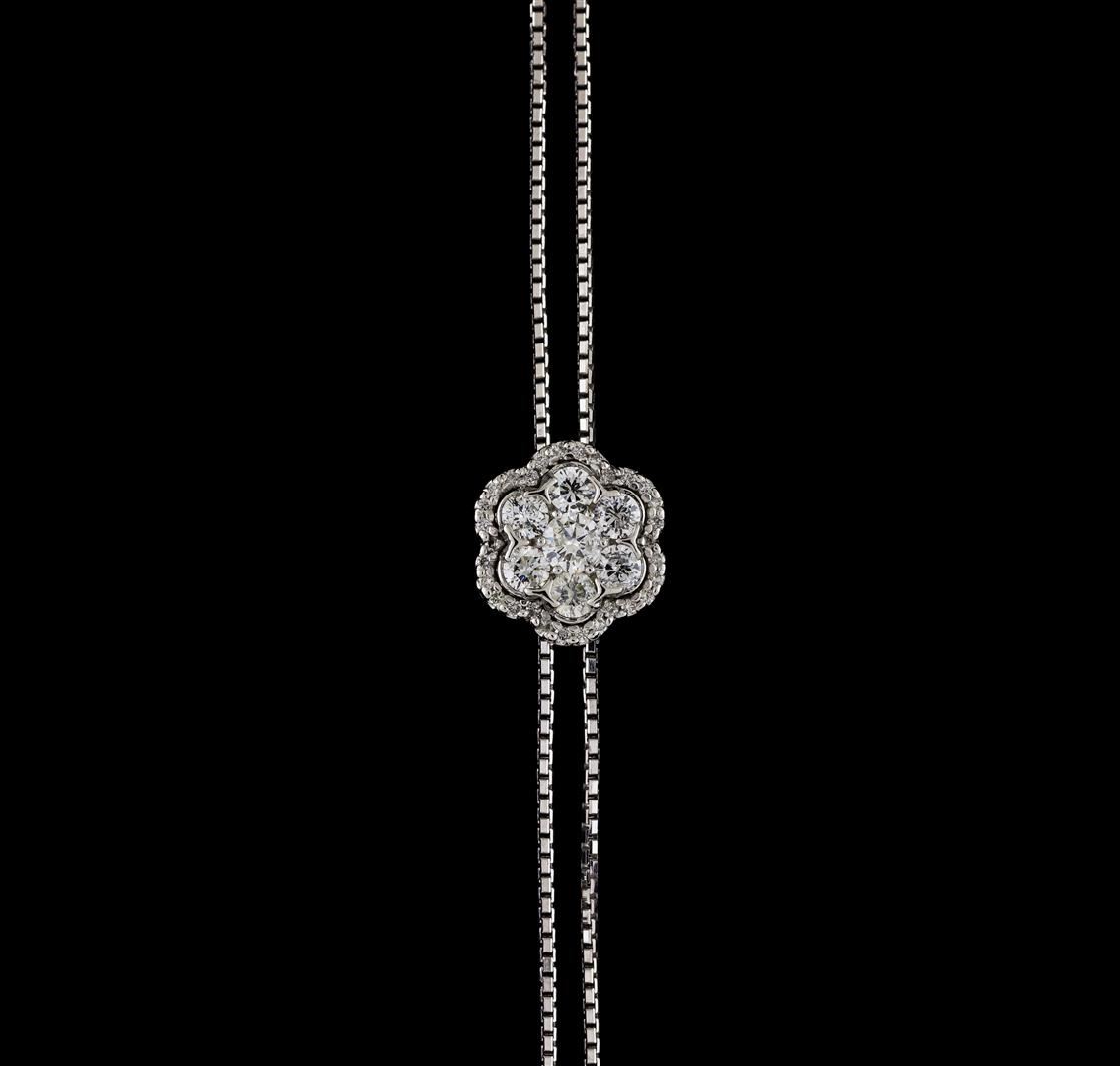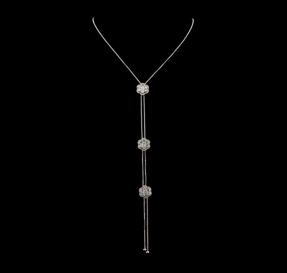 One electronically tested 14KT white gold lady's combination cast & assembled slide necklace with a lobster claw clasp with a bright polish finish. The featured lady's slide necklace has a 1.1 millimeter thick box chain measuring approximately 28 inches long with three attached, sliding diamond clusters. Identified with markings of 'K14'. Condition is new, good workmanship. Containing: Three prong set round brilliant cut diamonds, measuring 3.80 - 3.75 x 2.31mm (depth est.) approximate total weight of 3 Stones = 0.60ct. Graded in the setting. Clarity SI-2 to I-1. Color: G - H Cut Good Eighteen prong set round brilliant cut diamonds, measuring 3.00 - 2.90 x 1.77mm (depth est.) approximate total weight of 18 Stones = 1.68ct. Graded in the setting. Clarity SI-1 to I-1. Color: G - H Cut Good Ninety prong set round brilliant cut diamonds, measuring 1.15 - 1.05 x 0.68mm (depth est.) approximate total weight of 90 Stones = 0.45ct. Graded in the setting. Clarity SI-1 to SI-2. Color: G - I Cut Good. Total Weight of Diamonds 2.73ct.. Total Weight of Necklace 16.00gm. GAS Appraised at $9,720.00.