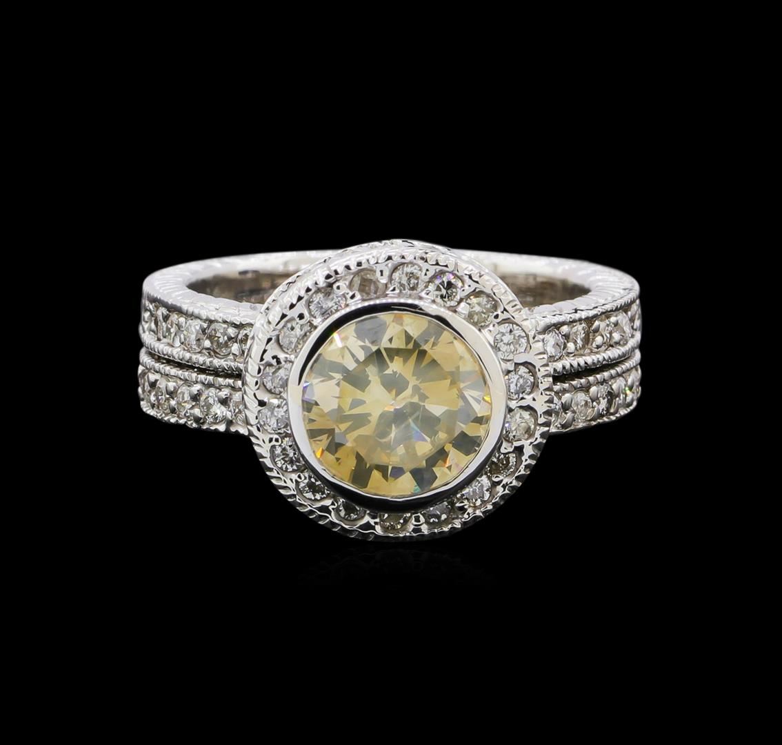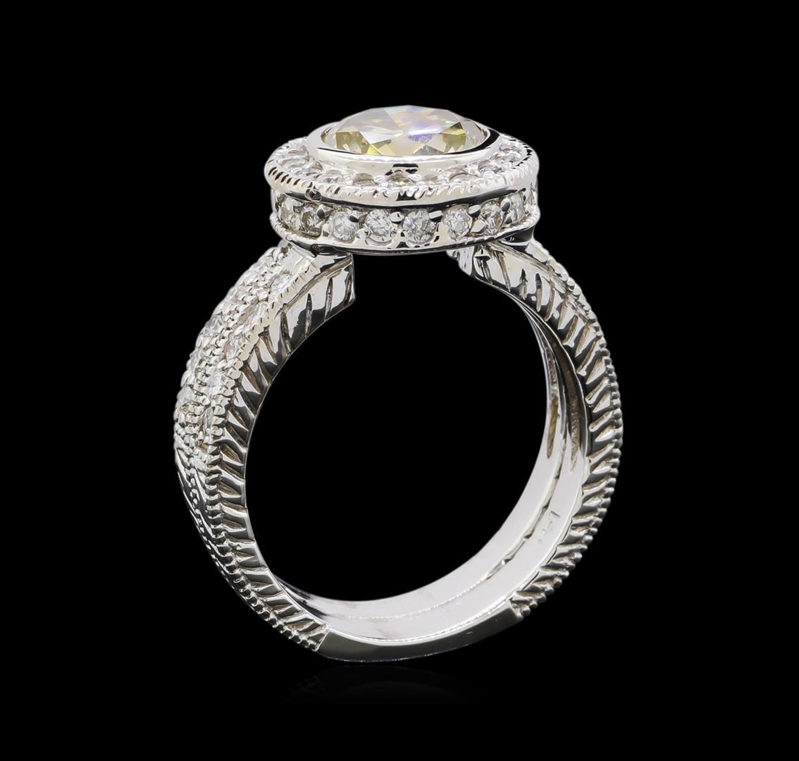 One electronically tested 14KT white gold ladies cast & assembled diamond ring. The featured diamond is set within a diamond bezel supported by diamond set split shoulders, completed by a patterned four and one-half millimeter wide band. Bright polish finish with milgrain detailing. Identified with markings of "14K". Condition is new, good workmanship. Containing: One bezel set round brilliant cut diamond, measuring 8.00 - 7.90 x 4.90mm (depth est.) approximate weight of 1.98ct with a medium yellow fluorescence. Graded in the setting. Clarity: I-1. Depth: 61.6%. Table 66.7%. Fifty-Eight bead set round brilliant cut diamonds, measuring 1.50 - 1.50 x 0.90mm (depth est.) approximate total weight of 58 Stones = 0.75ct. Graded in the setting. Clarity: I-1 to I-2. Color: H - J. Total Weight of Diamonds 2.73ct. Total Weight of Ring 8.65gm. AIG Appraised at $18,780.00.