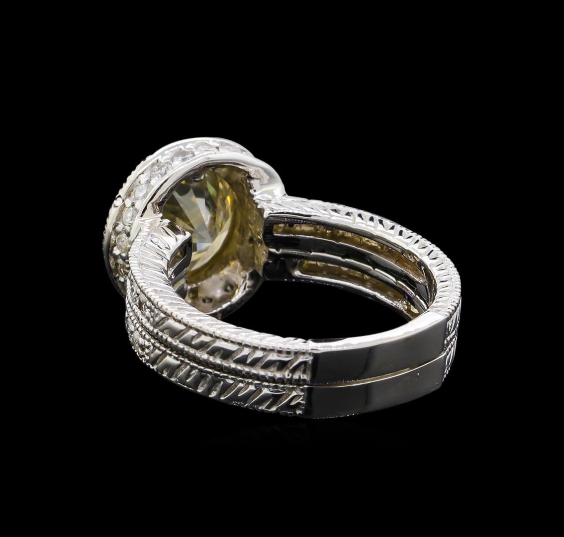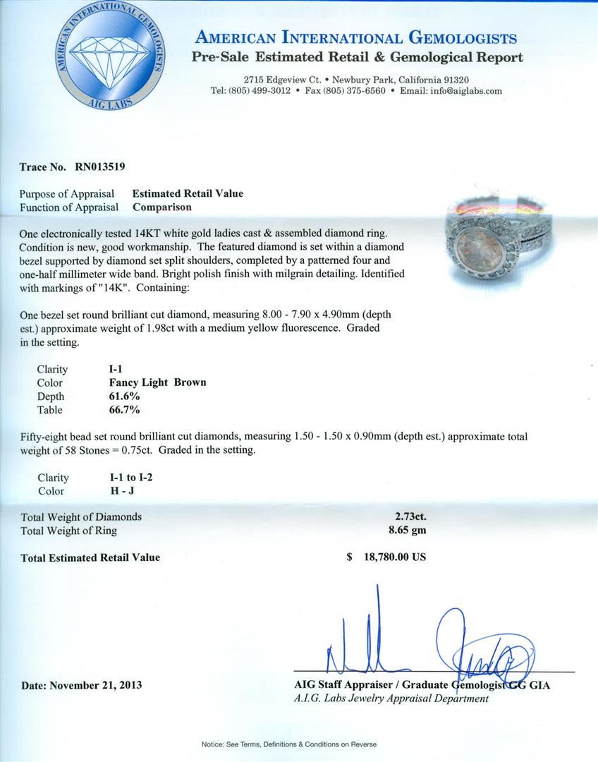 One electronically tested 14KT white gold ladies cast & assembled diamond ring. The featured diamond is set within a diamond bezel supported by diamond set split shoulders, completed by a patterned four and one-half millimeter wide band. Bright polish finish with milgrain detailing. Identified with markings of "14K". Condition is new, good workmanship. Containing: One bezel set round brilliant cut diamond, measuring 8.00 - 7.90 x 4.90mm (depth est.) approximate weight of 1.98ct with a medium yellow fluorescence. Graded in the setting. Clarity: I-1. Depth: 61.6%. Table 66.7%. Fifty-Eight bead set round brilliant cut diamonds, measuring 1.50 - 1.50 x 0.90mm (depth est.) approximate total weight of 58 Stones = 0.75ct. Graded in the setting. Clarity: I-1 to I-2. Color: H - J. Total Weight of Diamonds 2.73ct. Total Weight of Ring 8.65gm. AIG Appraised at $18,780.00.