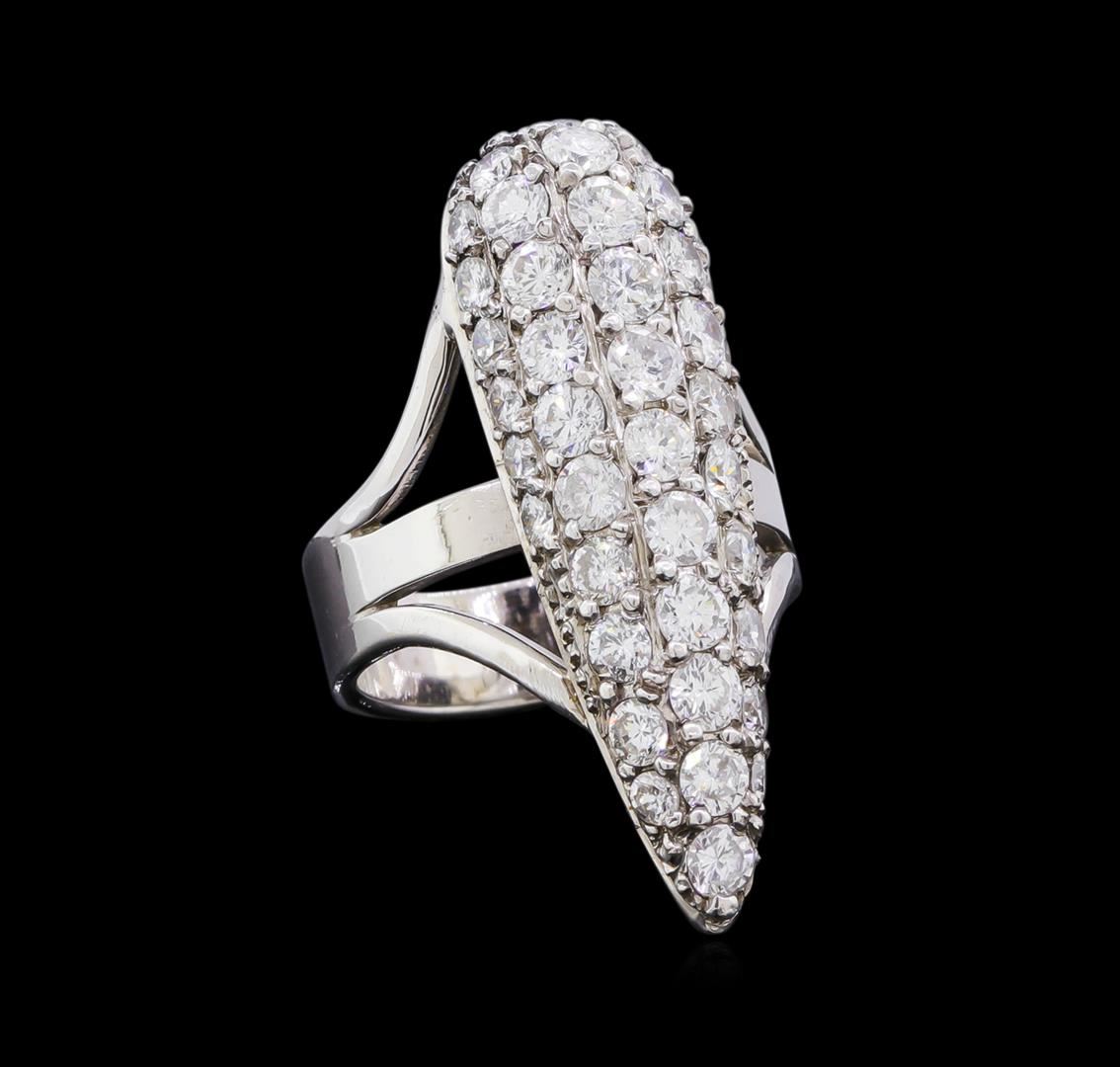 One electronically tested 14KT white gold ladies cast diamond ring. The ring features an elongated diamond set curvature supported by three-way split shoulders, completed by a five millimeter wide band. Bright and patterned finish. Identified with markings of "14K". Condition is new, good workmanship. Containing: Twenty-One prong set round brilliant cut diamonds, measuring 3.10 - 2.70 x 1.74mm (depth est.) approximate total weight of 21 Stones = 1.80ct. Color & clarity grade are an average for the group. Graded in the setting. Clarity: SI-2 to I-2. Color: G - I Eight prong set round brilliant cut diamonds, measuring 2.50 - 2.50 x 1.50mm (depth est.) approximate total weight of 8 Stones = 0.46ct. Color & clarity grade are an average for the group. Graded in the setting. Clarity: SI-2 to I-1. Color: G - I Thirteen prong set round brilliant cut diamonds, measuring 2.30 - 2.00 x 1.29mm (depth est.) approximate total weight of 13 Stones = 0.47ct. Color & clarity grade are an average for the group. Graded in the setting. Clarity: SI-2 to I-1. Color: G - I. Total Weight of Diamonds 2.73ct. Total Weight of Ring 7.94gm. AIG Appraised at $7,910.00.