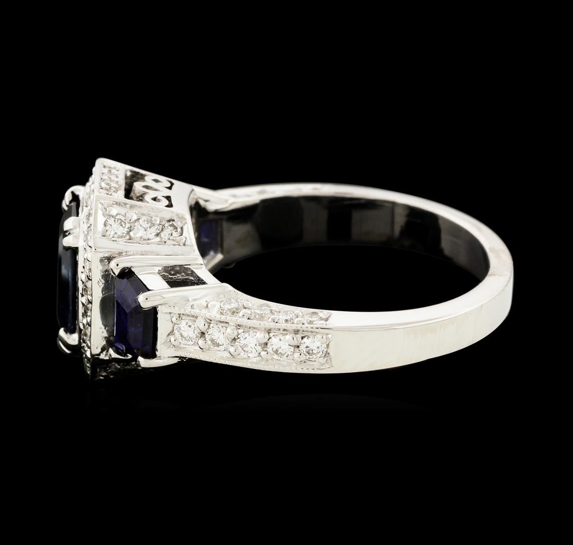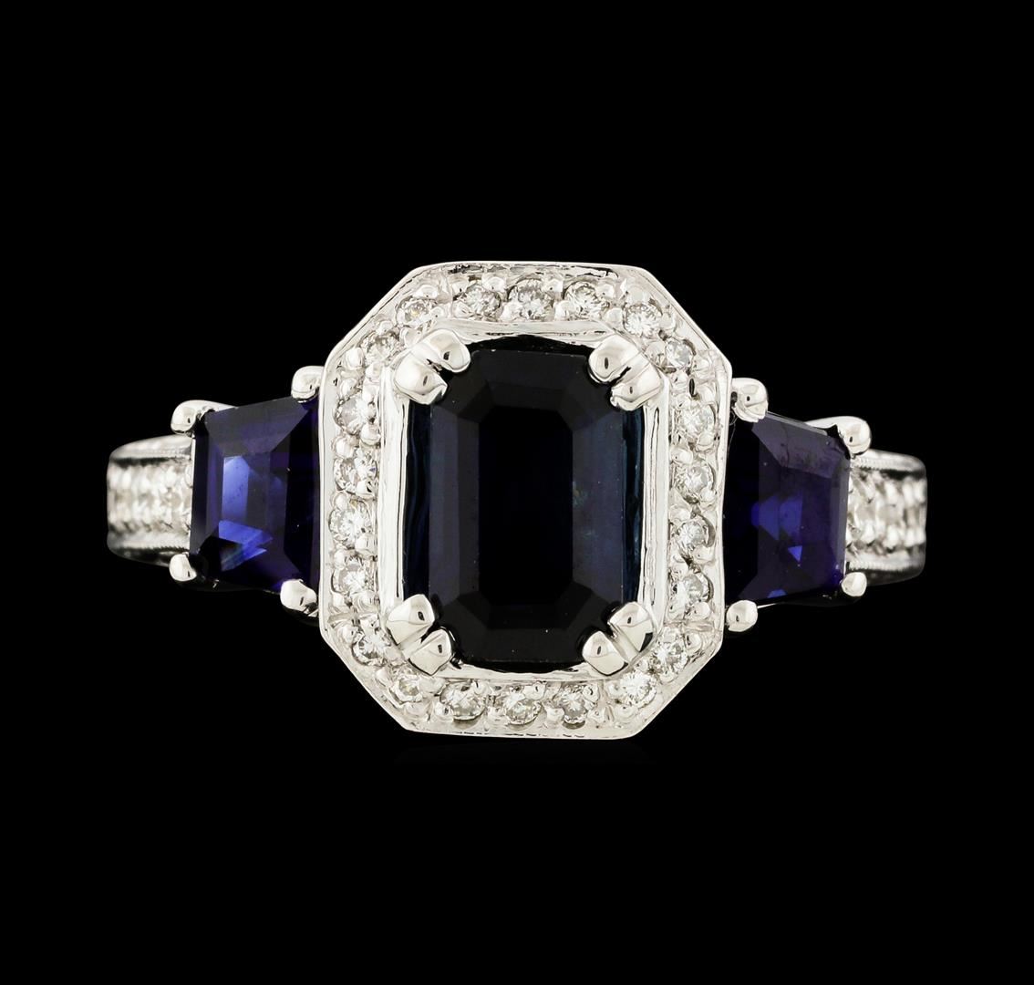 One electronically tested 14KT white gold lady's cast fashion ring with a cathedral shank with a halo with a bright polish with milgrain detailing finish. The featured lady's ring has a shank measuring 2.88 millimeters wide. Identified with markings of '14K'. Condition is new, good workmanship. Containing: One prong set emerald standard step cut natural blue sapphire, measuring 7.90 x 5.15 x 3.80mm, (depth est.) approximate weight of 1.63ct., clarity is slightly included, medium dark, moderately strong, blue color, (GIA B 6/4), cut is good. Transmitting light somewhat diffusely, transparent to translucent. Colored gemstones are presumed to have been subjected to commonly used enhancement processes. Graded in the setting. Two prong set step trapezoid cut natural blue sapphires, measuring 4.90 x 3.95 x 2.57mm, (depth est.) approximate total weight of 1.10ct., clarity is eye clean, medium dark, strong, violetish blue color, (GIA vB 6/5), cut is very good. Transmitting light with no distortion, transparent. Colored gemstones are presumed to have been subjected to commonly used enhancement processes. Graded in the setting. Eighteen prong set round brilliant cut diamonds, measuring 1.80 - 1.65 x 1.07mm (depth est.) approximate total weight of 18 Stones = 0.35ct. Graded in the setting. Clarity VS-2 to SI-1. Color: G - H Cut Very Good Forty-Two prong set round brilliant cut diamonds, measuring 1.40 - 1.20 x 0.81mm (depth est.) approximate total weight of 42 Stones = 0.34ct. Graded in the setting. Clarity VS-2 to SI-1. Color: G - H Cut Good Eight prong set round brilliant cut diamonds, measuring 0.90 - 0.85 x 0.54mm (depth est.) approximate total weight of 8 Stones = 0.02ct. Graded in the setting. Clarity VS-2 to SI-1. Color: G - H Cut Good. Total Weight of Colored Stones 2.73ct.. Total Weight of Diamonds 0.71ct.. Total Weight of Ring 8.10gm. GAS Appraised at $7,715.00.