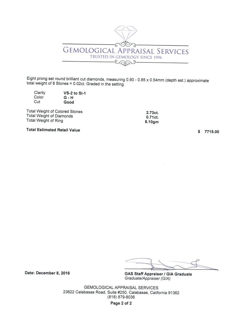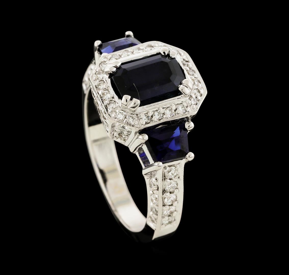 One electronically tested 14KT white gold lady's cast fashion ring with a cathedral shank with a halo with a bright polish with milgrain detailing finish. The featured lady's ring has a shank measuring 2.88 millimeters wide. Identified with markings of '14K'. Condition is new, good workmanship. Containing: One prong set emerald standard step cut natural blue sapphire, measuring 7.90 x 5.15 x 3.80mm, (depth est.) approximate weight of 1.63ct., clarity is slightly included, medium dark, moderately strong, blue color, (GIA B 6/4), cut is good. Transmitting light somewhat diffusely, transparent to translucent. Colored gemstones are presumed to have been subjected to commonly used enhancement processes. Graded in the setting. Two prong set step trapezoid cut natural blue sapphires, measuring 4.90 x 3.95 x 2.57mm, (depth est.) approximate total weight of 1.10ct., clarity is eye clean, medium dark, strong, violetish blue color, (GIA vB 6/5), cut is very good. Transmitting light with no distortion, transparent. Colored gemstones are presumed to have been subjected to commonly used enhancement processes. Graded in the setting. Eighteen prong set round brilliant cut diamonds, measuring 1.80 - 1.65 x 1.07mm (depth est.) approximate total weight of 18 Stones = 0.35ct. Graded in the setting. Clarity VS-2 to SI-1. Color: G - H Cut Very Good Forty-Two prong set round brilliant cut diamonds, measuring 1.40 - 1.20 x 0.81mm (depth est.) approximate total weight of 42 Stones = 0.34ct. Graded in the setting. Clarity VS-2 to SI-1. Color: G - H Cut Good Eight prong set round brilliant cut diamonds, measuring 0.90 - 0.85 x 0.54mm (depth est.) approximate total weight of 8 Stones = 0.02ct. Graded in the setting. Clarity VS-2 to SI-1. Color: G - H Cut Good. Total Weight of Colored Stones 2.73ct.. Total Weight of Diamonds 0.71ct.. Total Weight of Ring 8.10gm. GAS Appraised.
