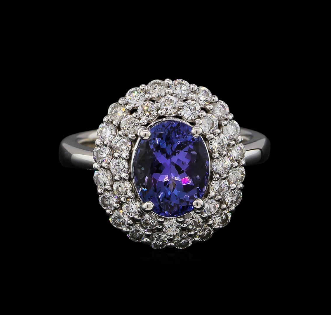 One electronically tested 14KT white gold lady's cast fashion ring with a basket double halo with a bright polish finish. The featured lady's ring has a shank measuring 3.14 millimeters wide. Identified with markings of "K14". Condition is new, good workmanship. Containing: One prong set oval modified brilliant cut natural tanzanite, measuring 9.25 x 7.24 x 5.81mm, approximate weight of 2.73ct., clarity is eye clean, type I, medium, moderately strong, bluish violet color, (GIA bV 5/4), cut is very good. Transmitting light with no distortion, transparent. Colored gemstones are presumed to have been subjected to commonly used enhancement processes. Graded in the setting. Twenty prong set round brilliant cut diamonds, measuring 2.10 - 2.00 x 1.27mm (depth est.) approximate total weight of 20 Stones = 0.67ct. Graded in the setting. Clarity: SI-1 to I-1. Color: H - I. Cut Good Sixteen prong set round brilliant cut diamonds, measuring 1.90 - 1.80 x 1.15mm (depth est.) approximate total weight of 16 Stones = 0.40ct. Graded in the setting. Clarity: SI-1 to I-1. Color: G - I. Cut Good. Total Weight of Colored Stones 2.73ct. Total Weight of Diamonds 1.07ct. Total Weight of Ring 6.20gm GAS Appraised.