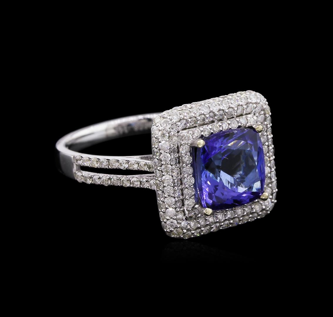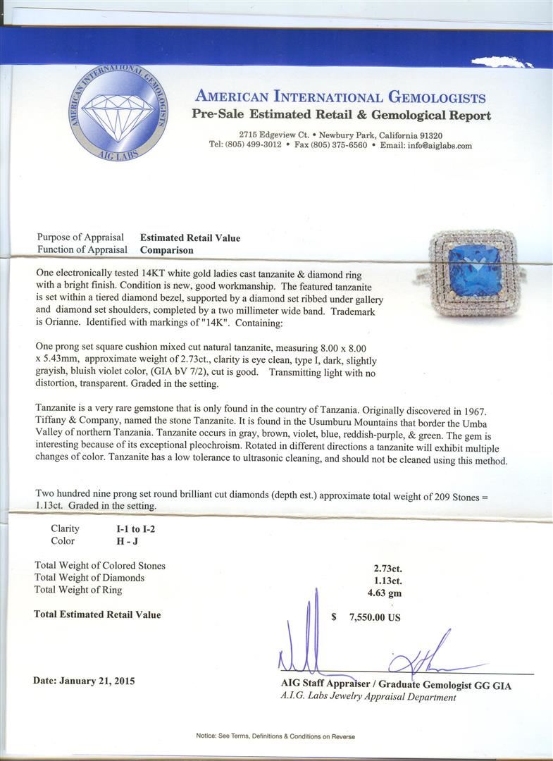 One electronically tested 14KT white gold ladies cast tanzanite & diamond ring with a bright finish. The featured tanzanite is set within a tiered diamond bezel, supported by a diamond set ribbed under gallery and diamond set shoulders, completed by a two millimeter wide band. Trademark is Orianne. Identified with markings of "14K". Condition is new, good workmanship. Containing: One prong set square cushion mixed cut natural tanzanite, measuring 8.00 x 8.00 x 5.43mm, approximate weight of 2.73ct., clarity is eye clean, type I, dark, slightly grayish, bluish violet color, (GIA bV 7/2), cut is good. Transmitting light with no distortion, transparent. Graded in the setting. Tanzanite is a very rare gemstone that is only found in the country of Tanzania. Originally discovered in 1967. Tiffany & Company, named the stone Tanzanite. It is found in the Usumburu Mountains that border the Umba Valley of northern Tanzania. Tanzanite occurs in gray, brown, violet, blue, reddish-purple, & green. The gem is interesting because of its exceptional pleochroism. Rotated in different directions a tanzanite will exhibit multiple changes of color. Tanzanite has a low tolerance to ultrasonic cleaning, and should not be cleaned using this method. Two Hundred Nine prong set round brilliant cut diamonds (depth est.) approximate total weight of 209 Stones = 1.13ct. Graded in the setting. Clarity: I-1 to I-2. Color: H - J. Total Weight of Colored Stones 2.73ct. Total Weight of Diamonds 1.13ct. AIG Appraised at $7,550.00.