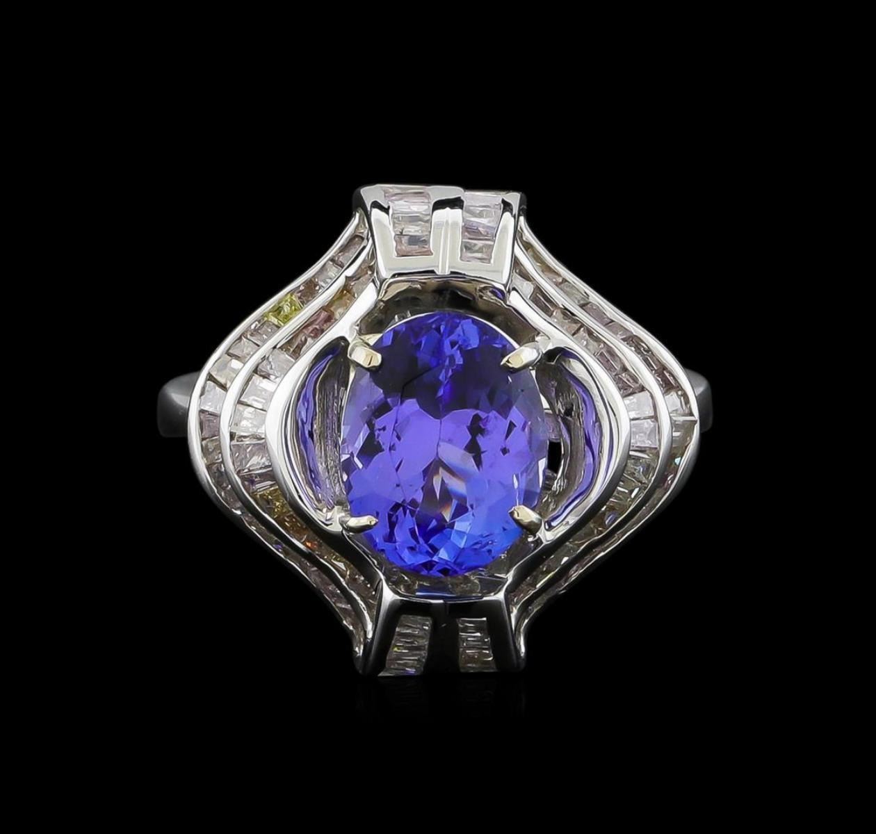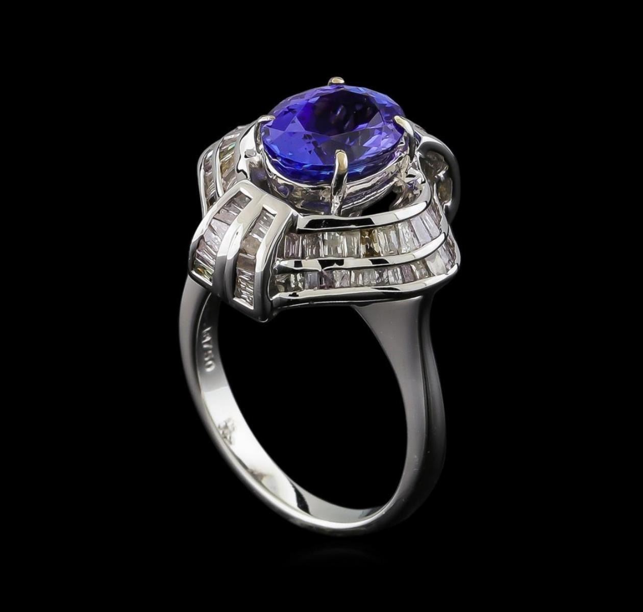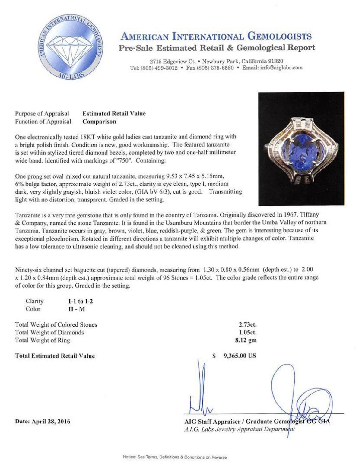 One electronically tested 18KT white gold ladies cast tanzanite and diamond ring with a bright polish finish. The featured tanzanite is set within stylized tiered diamond bezels, completed by two and one-half millimeter wide band. Identified with markings of "750". Condition is new, good workmanship. Containing: One prong set oval mixed cut natural tanzanite, measuring 9.53 x 7.45 x 5.15mm, 6%. bulge factor, approximate weight of 2.73ct., clarity is eye clean, type I, medium dark, very slightly grayish, bluish violet color, (GIA bV 6/3), cut is good. Transmitting light with no distortion, transparent. Graded in the setting. Tanzanite is a very rare gemstone that is only found in the country of Tanzania. Originally discovered in 1967. Tiffany & Company, named the stone Tanzanite. It is found in the Usumburu Mountains that border the Umba Valley of northern Tanzania. Tanzanite occurs in gray, brown, violet, blue, reddish-purple, & green. The gem is interesting because of its exceptional pleochroism. Rotated in different directions a tanzanite will exhibit multiple changes of color. Tanzanite has a low tolerance to ultrasonic cleaning, and should not be cleaned using this method. Ninety-Six channel set baguette cut (tapered) diamonds, measuring from 1.30 x 0.80 x 0.56mm (depth est.) to 2.00 x 1.20 x 0.84mm (depth est.) approximate total weight of 96 Stones = 1.05ct. The color grade reflects the entire range of color for this group. Graded in the setting. Clarity: I-1 to I-2. Color: H - M. Total Weight of Colored Stones 2.73ct. Total Weight of Diamonds 1.05ct. Total Weight of Ring 8.12gm.
