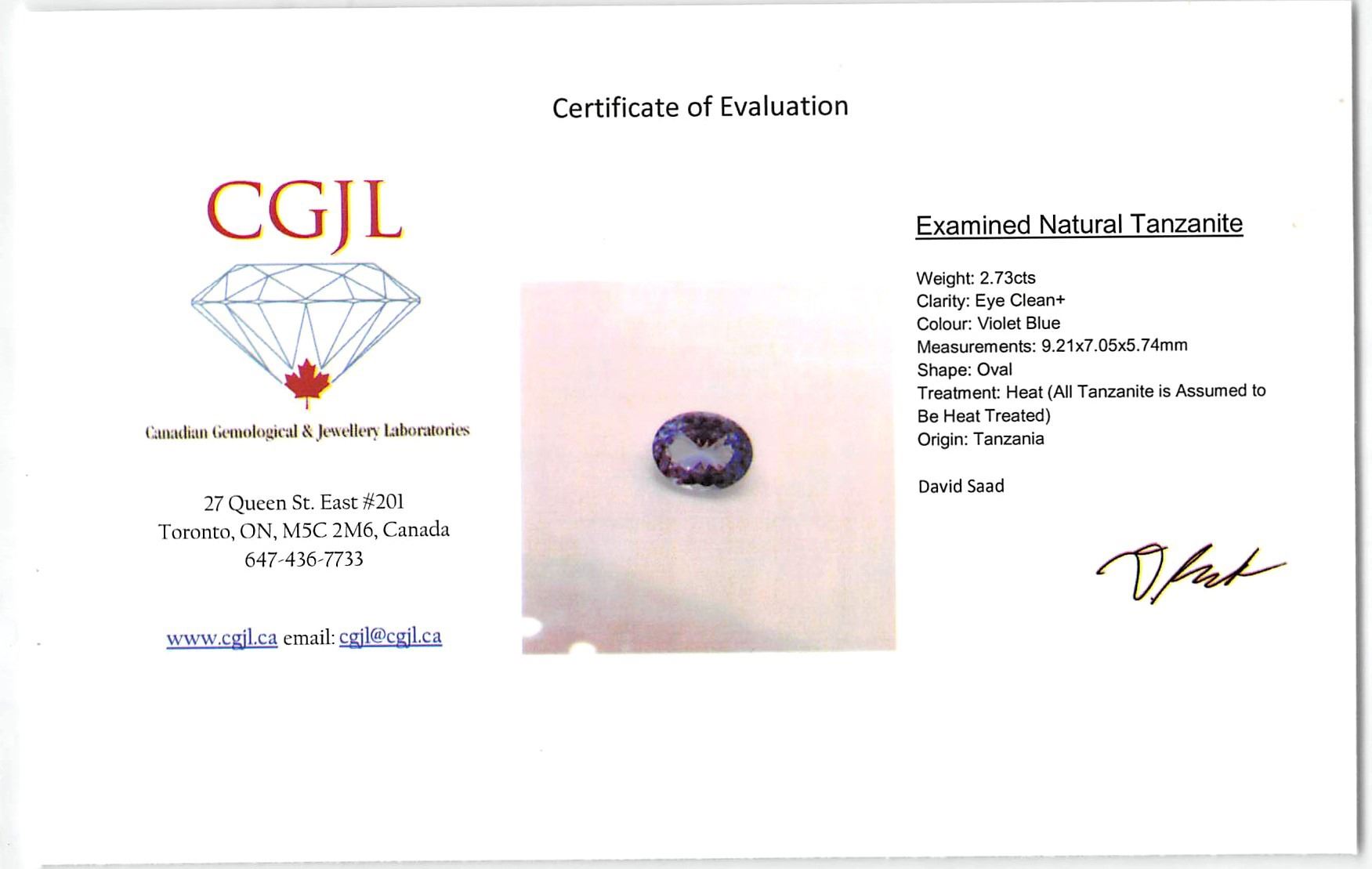 One 2.73ct Tanzanite Oval Gemstone. One oval mixed cut natural tanzanite, measuring 9.21 x 7.05 x 5.74mm, 3%. bulge factor, exact weight 2.73ct. Clarity is eye clean, type I, medium light, slightly grayish, bluish violet color, cut is good.