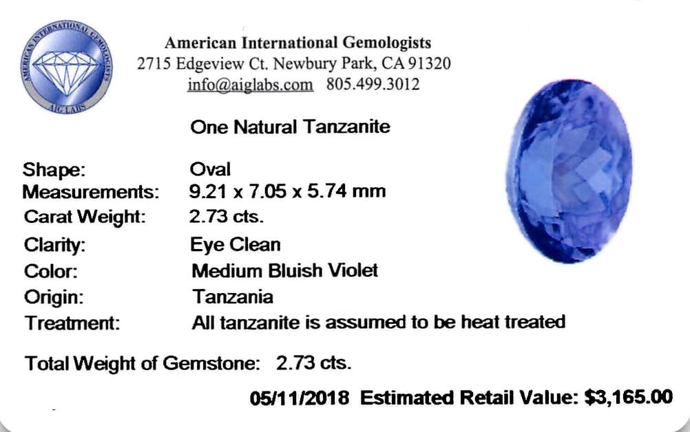 One 2.73ct Tanzanite Oval Gemstone. One oval mixed cut natural tanzanite, measuring 9.21 x 7.05 x 5.74mm, 3%. bulge factor, exact weight 2.73ct. Clarity is eye clean, type I, medium light, slightly grayish, bluish violet color, cut is good.