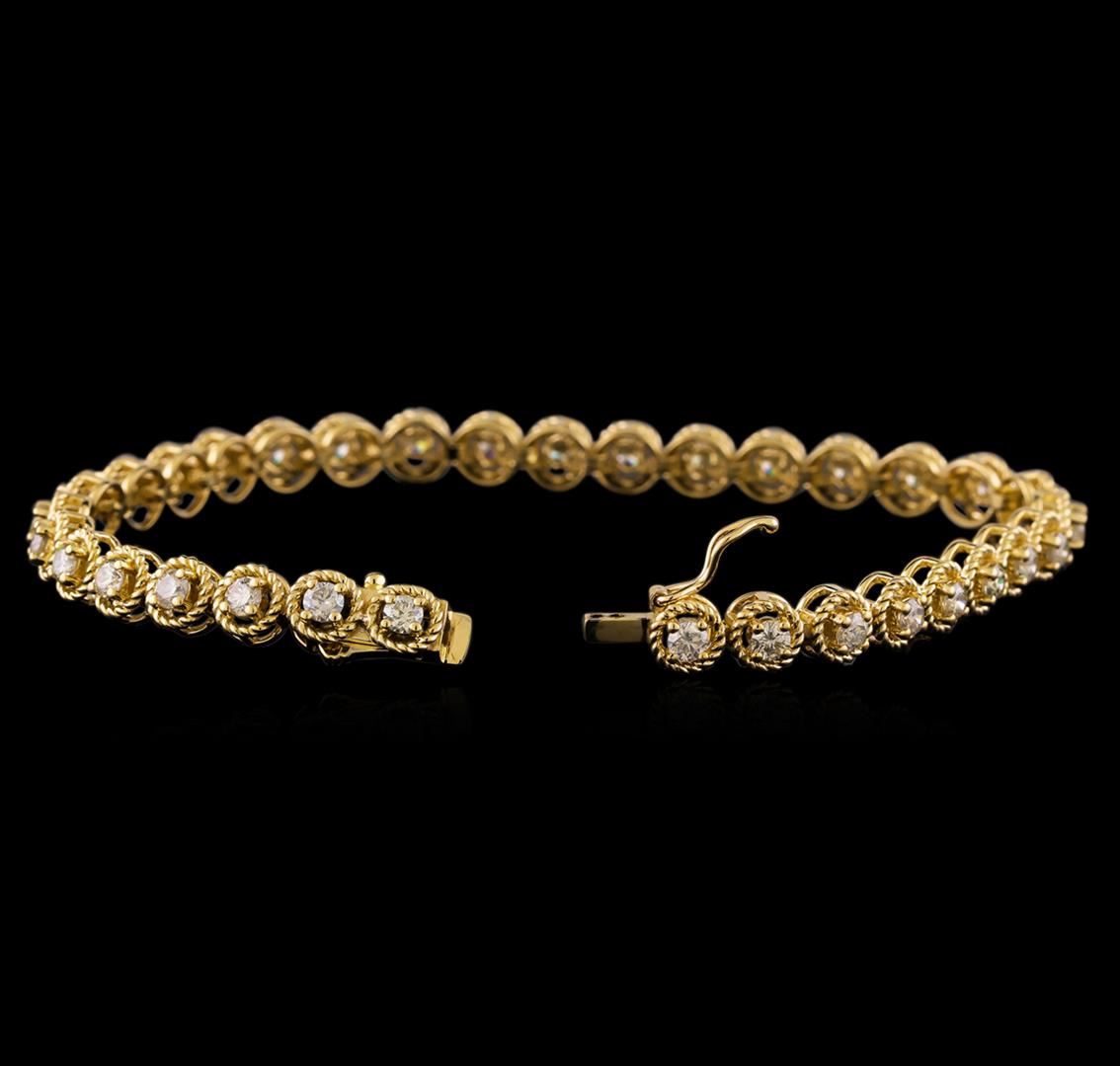 One electronically tested 14KT yellow gold lady's combination cast & assembled straight line fashion bracelet with a tongue clasp with fold over safety with a bright polish with milgrain detailing finish. The featured lady's bracelet has length measuring 7 inches. Identified with markings of "K14". Condition is new, good workmanship. Containing: Thirty-Three prong set round brilliant cut diamonds, measuring 2.90 - 2.80 x 1.71mm (depth est.) approximate total weight of 33 Stones = 2.74ct. Graded in the setting. Clarity: VS-2 to SI-1. Color: H - I. Cut Good. Total Weight of Diamonds 2.74ct. Total Weight of Bracelet 12.80gm. GAS Appraised at $8,790.00.