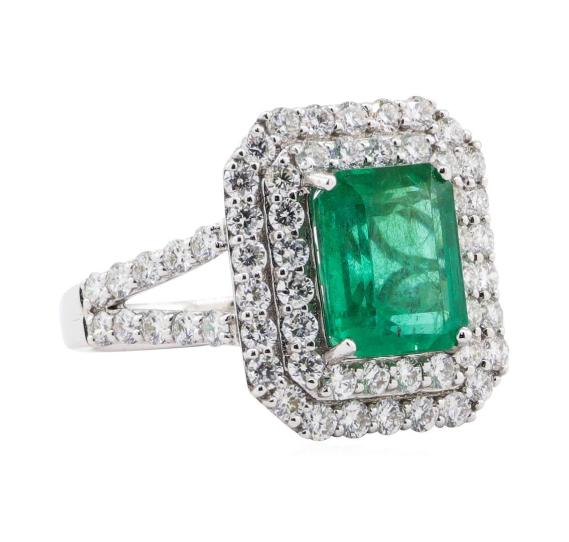 One electronically tested 18KT white gold ladies cast emerald & diamond ring. The ring features an emerald set within a tiered diamond bezel, supported by an elaborate lattice under gallery and split diamond set shoulders, completed by a two millimeter wide band. Bright polish finish. Trademark is Orianne. Identified with markings of "18K". Condition is new, good workmanship. Containing: One prong set rectangular step cut natural emerald, measuring 9.00 x 7.20 x 5.20mm, exact weight 2.74ct., clarity is heavily included, type III, medium, moderately strong, very slightly bluish green color, (GIA vslbG 5/4), cut is good. Transmitting light somewhat diffusely, transparent to translucent. Naturally occurring internal & external characteristics are present. Graded in the setting. Sixty-Six prong set round brilliant cut diamonds exact total weight 66 Stones = 1.40ct. Graded in the setting. Clarity SI-2 to I-2 Color G - I Total Weight of Colored Stones 2.74 ct. Total Weight of Diamonds 1.40 ct. Total Weight of Ring 4.50 gm Estimated Retail Value $ 22,310.00 US