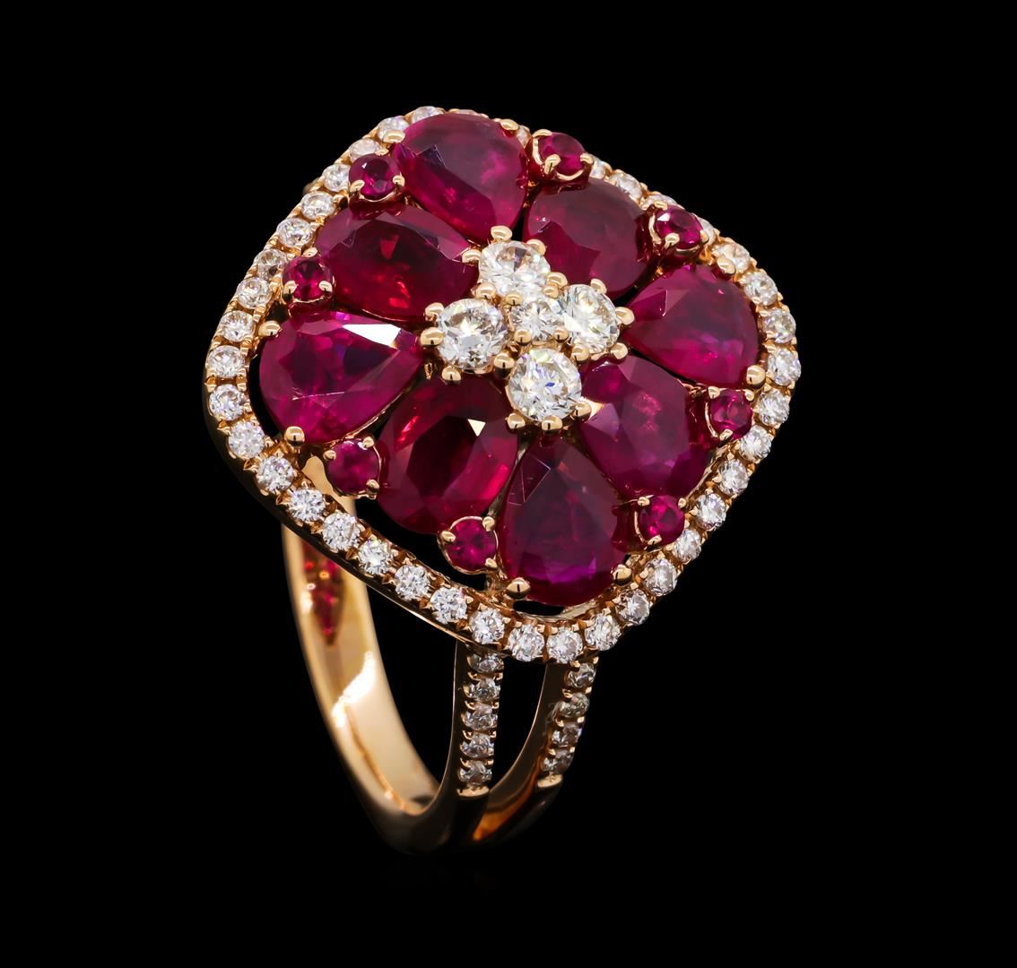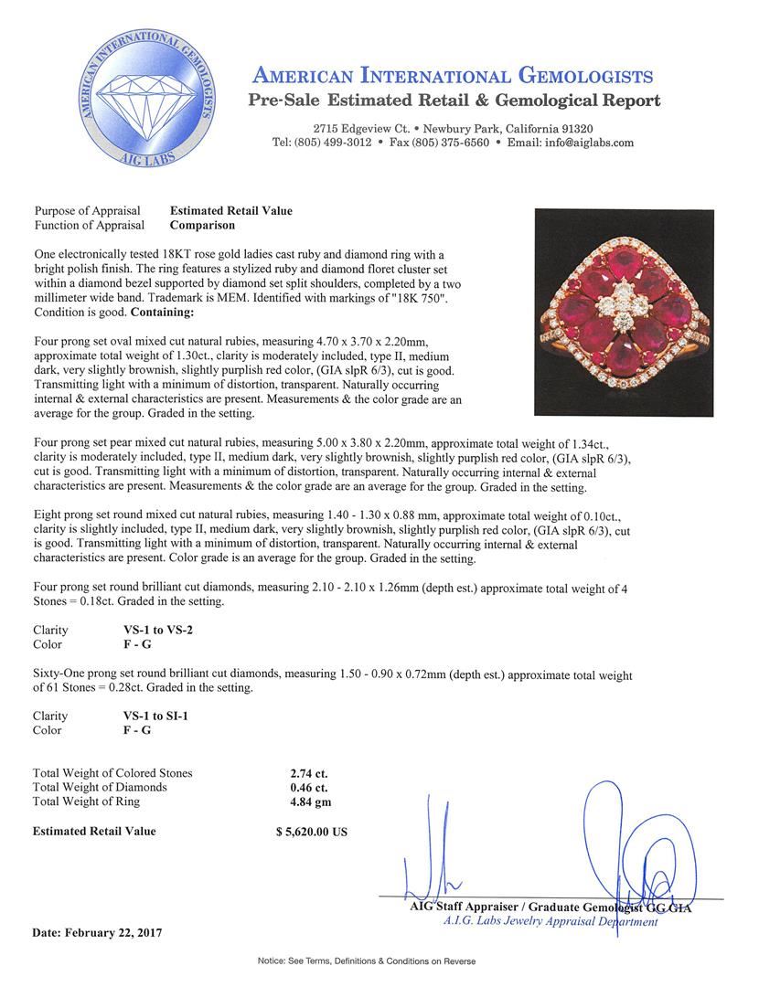 One prong set round brilliant cut diamonds, measuring 1.50 - 0.90 x 0.72mm (depth est.) approximate total weight of 61 Stones = 0.28ct. Graded in the setting. Clarity VS-1 to SI-1. Color: F - G. Total Weight of Colored Stones 2.74ct.. Total Weight of Diamonds 0.46ct.. Total Weight of Ring 4.84gm. AIG Appraised at $5,620.00.