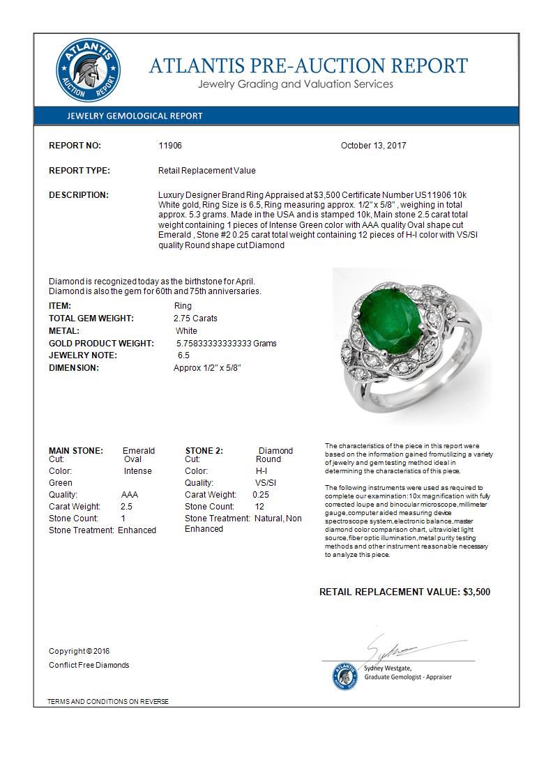 11906 - REF-52V7Y ---- 2.75 CTW Emerald & Diamond Ring 10K White Gold ---- Luxury Designer Brand Ring Appraised at $3,500 Certificate Number US11906 10k White gold, Ring Size is 6.5, Ring measuring approx. 1/2" x 5/8" , weighing in total approx. 5.3 grams. Made in the USA and is stamped 10k, Main stone 2.5 carat total weight containing 1 pieces of Intense Green color with AAA quality Oval shape cut Emerald , Stone #2 0.25 carat total weight containing 12 pieces of H-I color with VS/SI quality Round shape cut Diamond