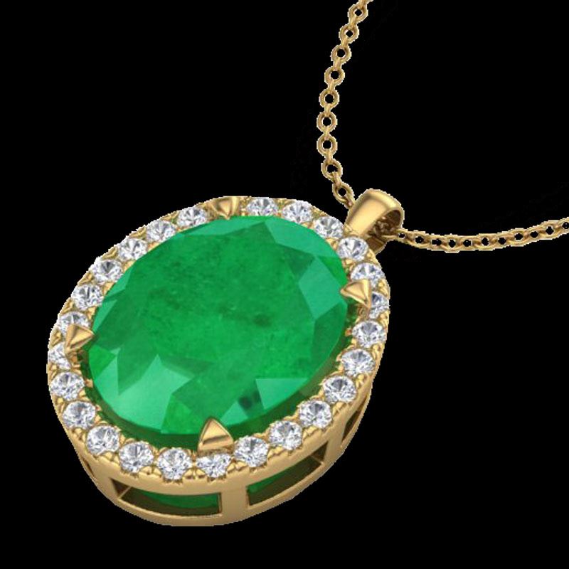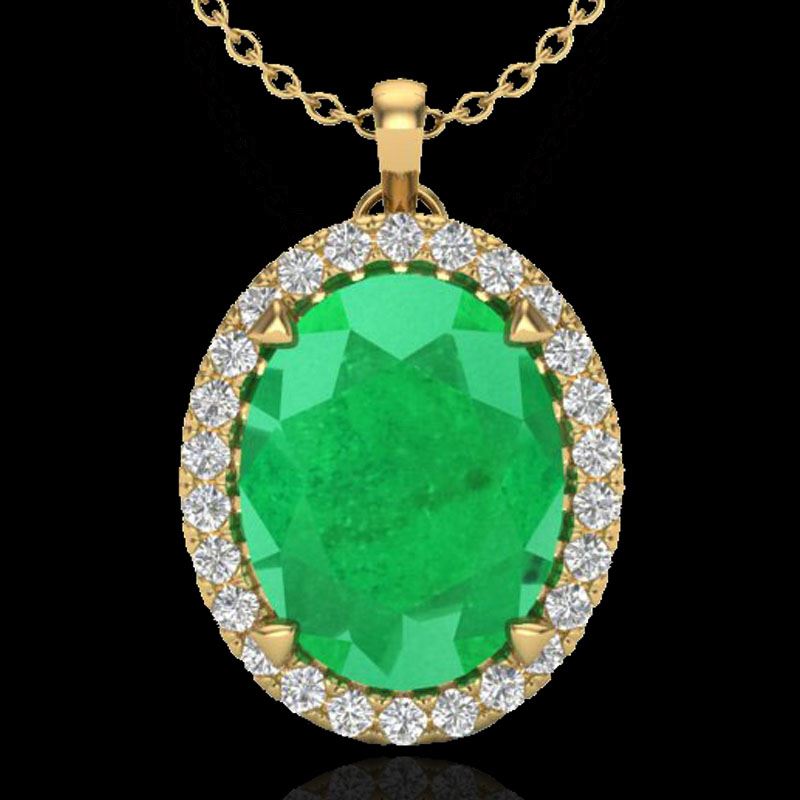 REF-60W2F -20588 ---- 2.75 CTW Emerald & Micro VS/SI Diamond Halo Solitaire Necklace 18K Yellow Gold ---- Luxury Designer Brand Necklace Appraised at $3,950 Certificate Number US20588 18k Yellow gold, Necklace Size is 16 Inches, Necklace measuring approx. 1/2" X 1/2" , weighing in total approx. 3.8 grams. Made in the USA and is stamped 18k, Main stone 2.55 carat total weight containing 1 pieces of Intense Green color with AAA quality Oval shape cut Emerald , Stone #2 0.2 carat total weight containing 26 pieces of H-I color with VS/SI quality Round shape cut Diamond