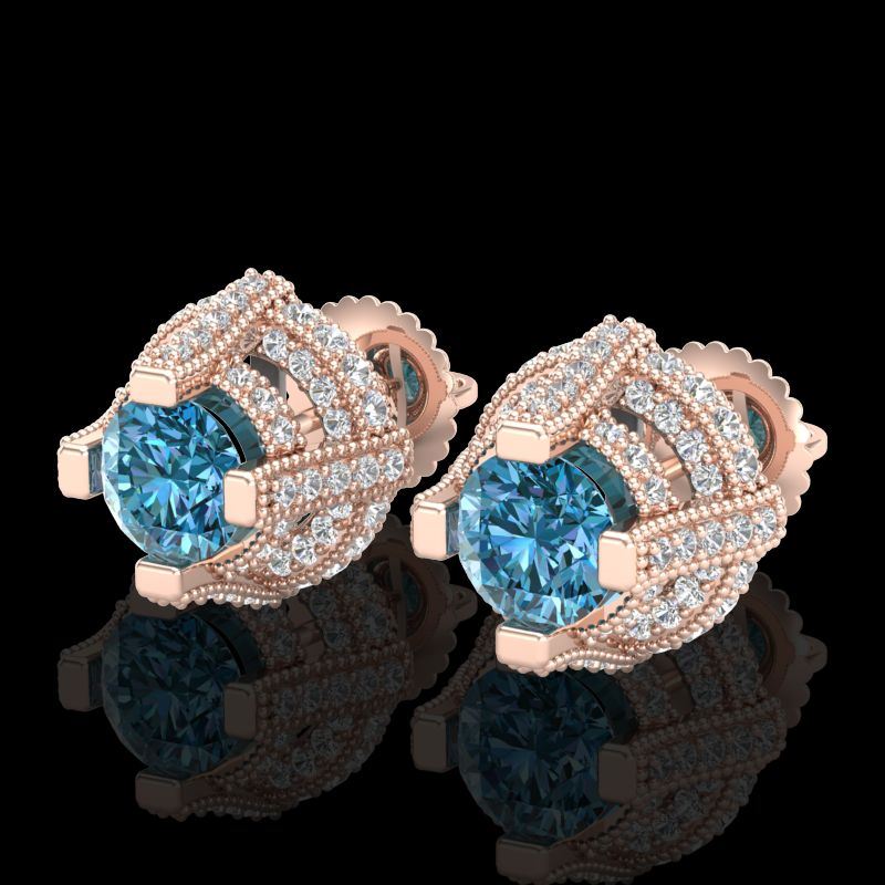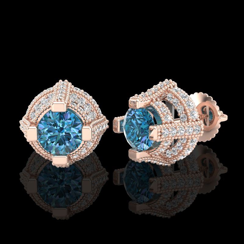 REF-236M4H -37629 ---- 2.75 CTW Fancy Intense Blue Diamond Micro Pave Stud Earrings 18K Rose Gold ---- Luxury Designer Brand Earring Appraised at $15,600 Certificate Number US37629 18k Rose gold, Earring Size is Larger, Earring measuring approx. Uniform, weighing in total approx. 8 grams. Made in the USA and is stamped 18k, Main stone 1.11 carat total weight containing 2 pieces of Intense Fancy Blue color with SI quality Round shape cut Diamond , Stone #2 1.64 carat total weight containing 128 pieces of H-I color with VS/SI quality Round shape cut Diamond