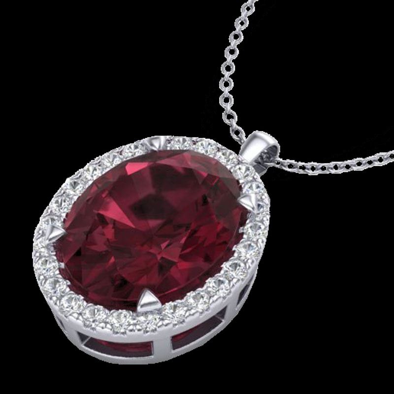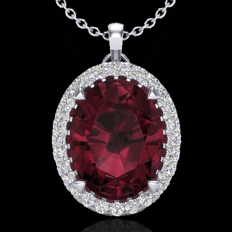 REF-48A4X -20590 ---- 2.75 CTW Garnet & Micro VS/SI Diamond Halo Solitaire Necklace 18K White Gold ---- Luxury Designer Brand Necklace Appraised at $3,200 Certificate Number US20590 18k White gold, Necklace Size is 16 Inches, Necklace measuring approx. 1/2" X 1/2" , weighing in total approx. 3.8 grams. Made in the USA and is stamped 18k, Main stone 2.55 carat total weight containing 1 pieces of Saturated purplish Red color with AAA quality Oval shape cut Garnet , Stone #2 0.2 carat total weight containing 26 pieces of H-I color with VS/SI quality Round shape cut Diamond