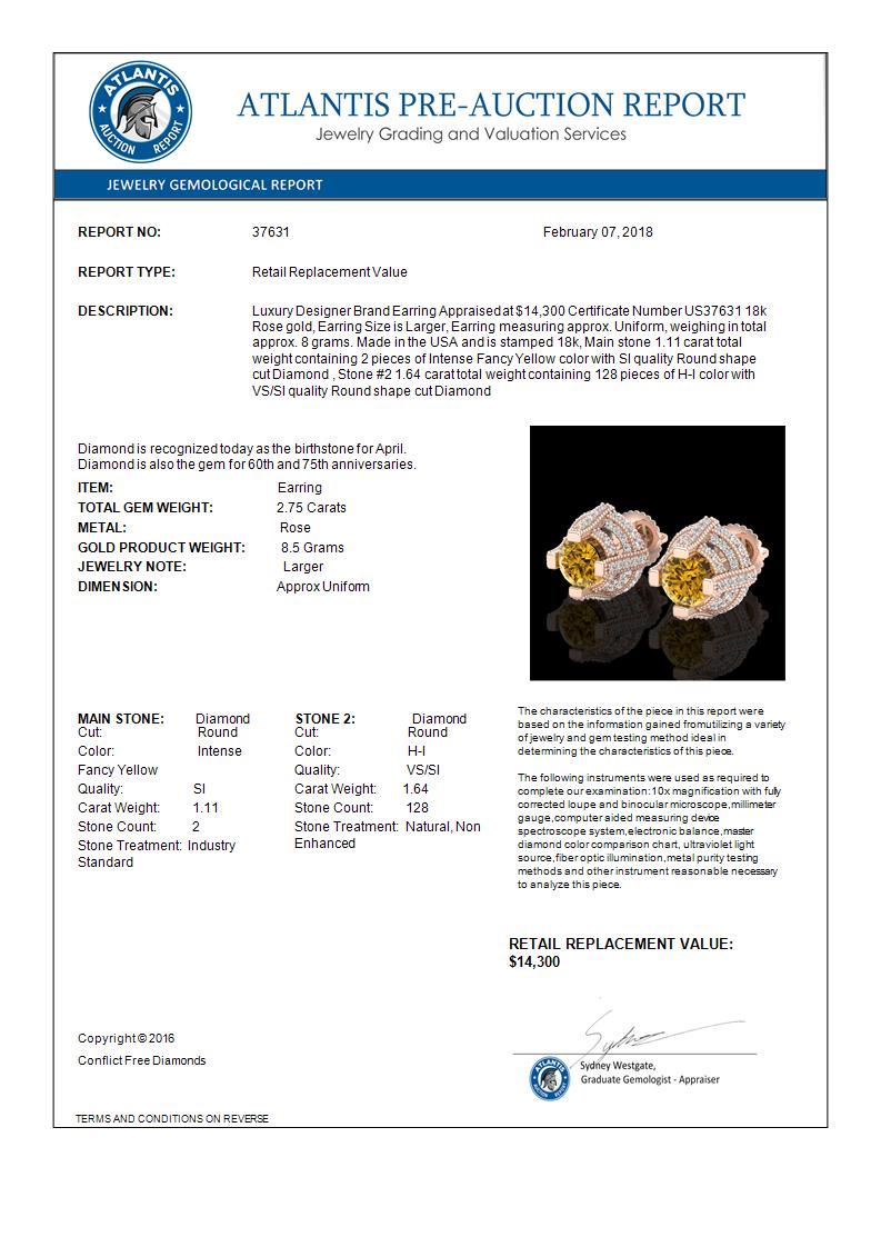 REF-236K4W -37631 ---- 2.75 CTW Intense Fancy Yellow Diamond Micro Pave Stud Earrings 18K Rose Gold ---- Luxury Designer Brand Earring Appraised at $14,300 Certificate Number US37631 18k Rose gold, Earring Size is Larger, Earring measuring approx. Uniform, weighing in total approx. 8 grams. Made in the USA and is stamped 18k, Main stone 1.11 carat total weight containing 2 pieces of Intense Fancy Yellow color with SI quality Round shape cut Diamond , Stone #2 1.64 carat total weight containing 128 pieces of H-I color with VS/SI quality Round shape cut Diamond