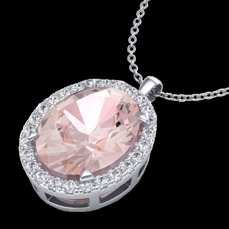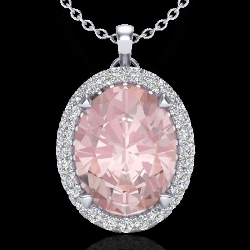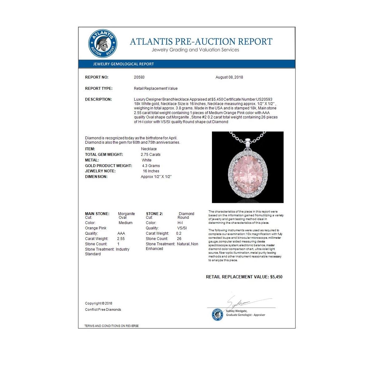 REF-82W8F -20593 ---- 2.75 CTW Morganite & Micro VS/SI Diamond Halo Solitaire Necklace 18K White Gold ---- Luxury Designer Brand Necklace Appraised at $5,450 Certificate Number US20593 18k White gold, Necklace Size is 16 Inches, Necklace measuring approx. 1/2" X 1/2" , weighing in total approx. 3.8 grams. Made in the USA and is stamped 18k, Main stone 2.55 carat total weight containing 1 pieces of Medium Orange Pink color with AAA quality Oval shape cut Morganite , Stone #2 0.2 carat total weight containing 26 pieces of H-I color with VS/SI quality Round shape cut Diamond