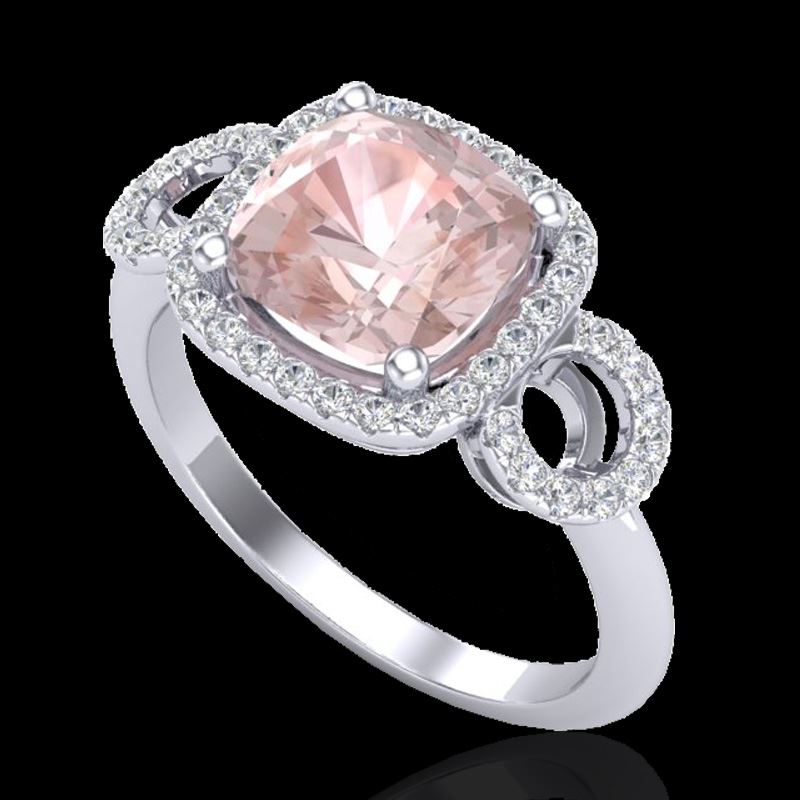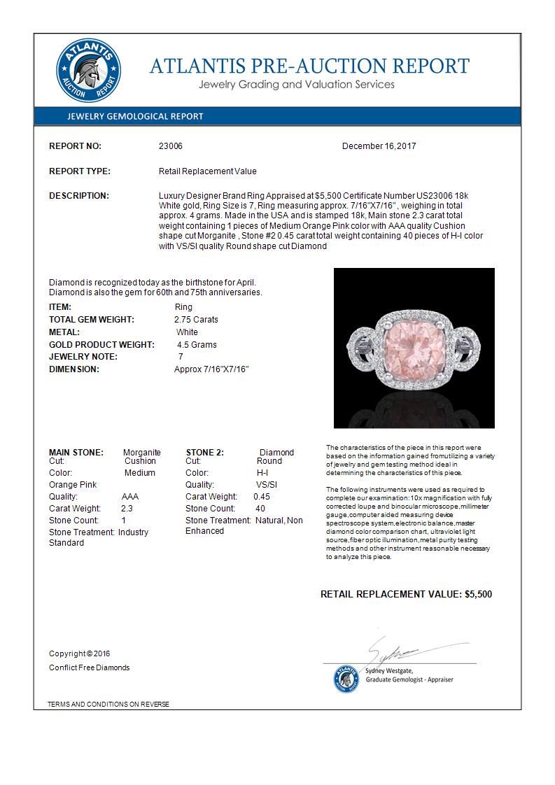 REF-83Y3K -23006 ---- 2.75 CTW Morganite & Micro VS/SI Diamond Ring 18K White Gold ---- Luxury Designer Brand Ring Appraised at $5,500 Certificate Number US23006 18k White gold, Ring Size is 7, Ring measuring approx. 7/16"X7/16" , weighing in total approx. 4 grams. Made in the USA and is stamped 18k, Main stone 2.3 carat total weight containing 1 pieces of Medium Orange Pink color with AAA quality Cushion shape cut Morganite , Stone #2 0.45 carat total weight containing 40 pieces of H-I color with VS/SI quality Round shape cut Diamond