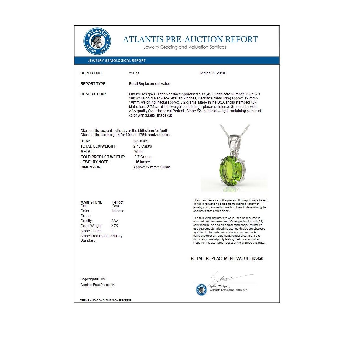 REF-34H4A -21873 ---- 2.75 CTW Peridot Designer Inspired Solitaire Necklace 18K White Gold ---- Luxury Designer Brand Necklace Appraised at $2,450 Certificate Number US21873 18k White gold, Necklace Size is 16 Inches, Necklace measuring approx. 12 mm x 10mm, weighing in total approx. 3.2 grams. Made in the USA and is stamped 18k, Main stone 2.75 carat total weight containing 1 pieces of Intense Green color with AAA quality Oval shape cut Peridot , Stone #2 carat total weight containing pieces of color with quality shape cut