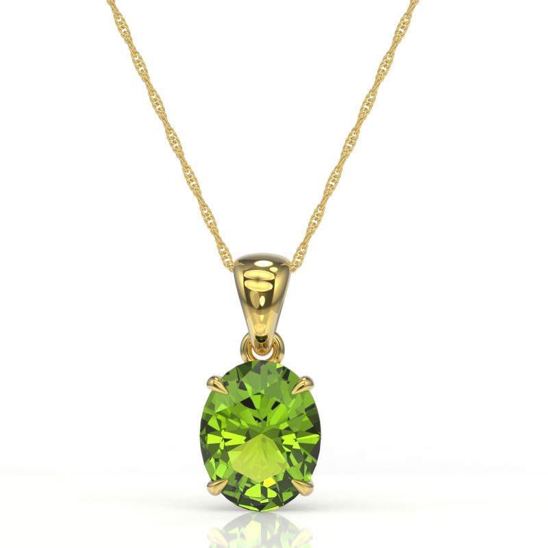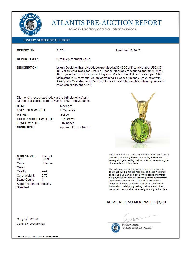 REF-34W4F -21874 ---- 2.75 CTW Peridot Designer Inspired Solitaire Necklace 18K Yellow Gold ---- Luxury Designer Brand Necklace Appraised at $2,450 Certificate Number US21874 18k Yellow gold, Necklace Size is 16 Inches, Necklace measuring approx. 12 mm x 10mm, weighing in total approx. 3.2 grams. Made in the USA and is stamped 18k, Main stone 2.75 carat total weight containing 1 pieces of Intense Green color with AAA quality Oval shape cut Peridot , Stone #2 carat total weight containing pieces of color with quality shape cut