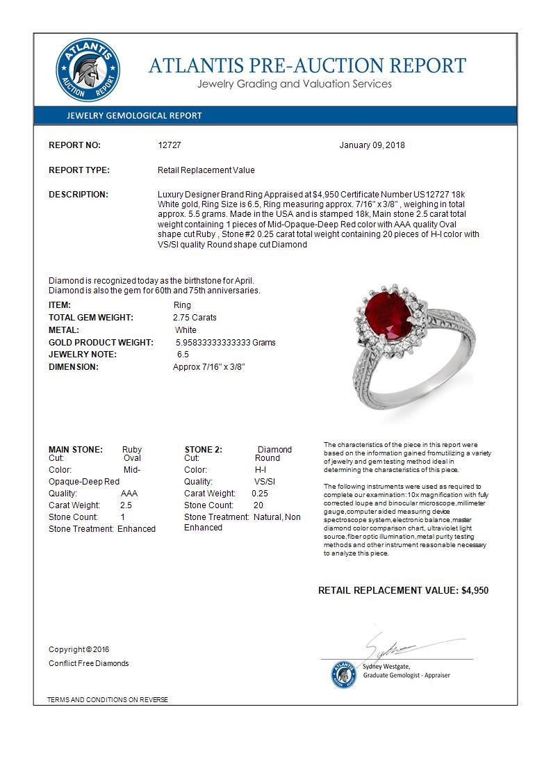 REF-69X3T -12727 ---- 2.75 CTW Ruby & Diamond Ring 18K White Gold ---- Luxury Designer Brand Ring Appraised at $4,950 Certificate Number US12727 18k White gold, Ring Size is 6.5, Ring measuring approx. 7/16" x 3/8" , weighing in total approx. 5.5 grams. Made in the USA and is stamped 18k, Main stone 2.5 carat total weight containing 1 pieces of Mid-Opaque-Deep Red color with AAA quality Oval shape cut Ruby , Stone #2 0.25 carat total weight containing 20 pieces of H-I color with VS/SI quality Round shape cut Diamond