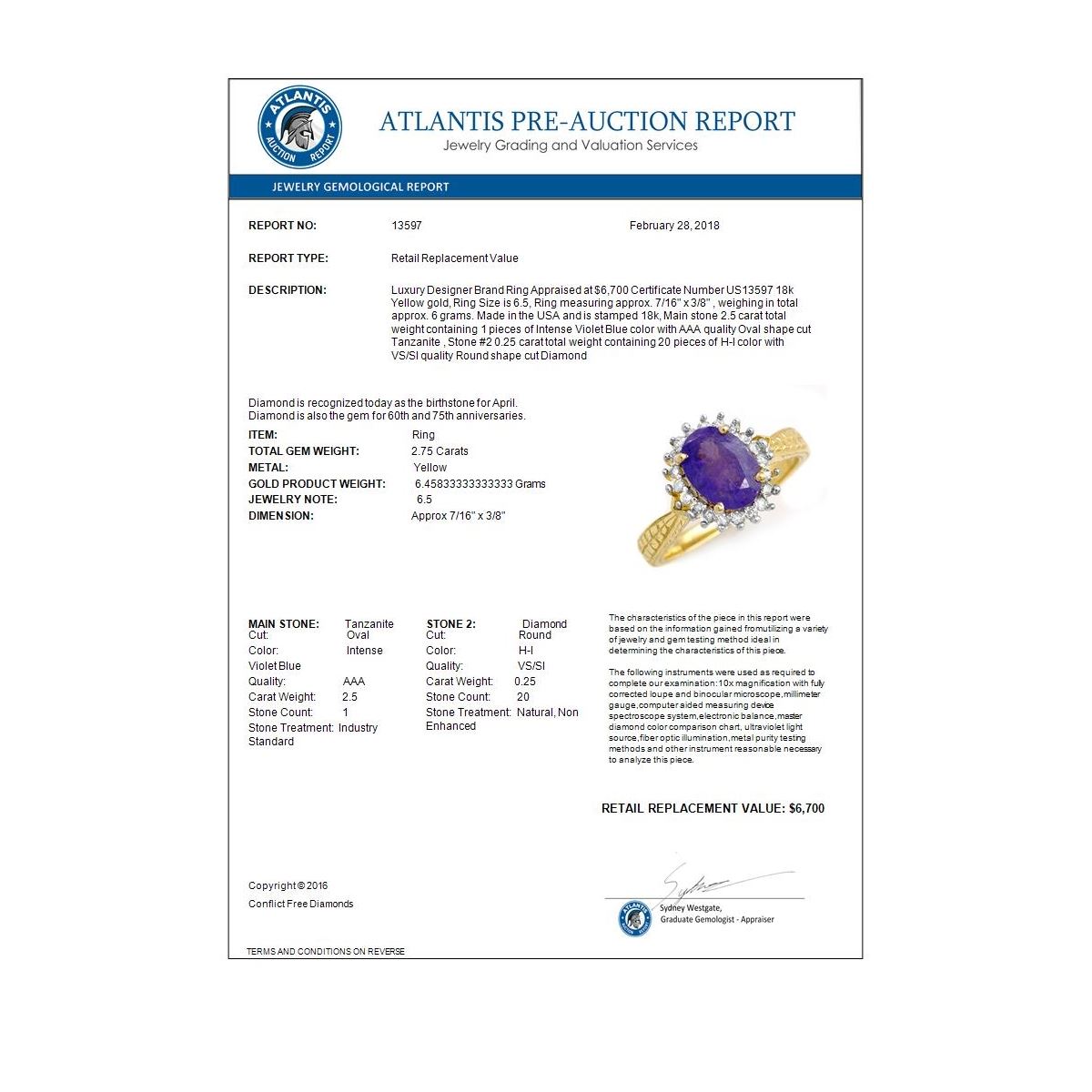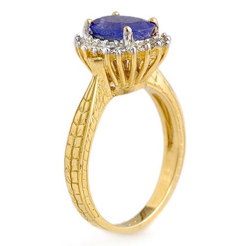 REF-87K3W -13597 ---- 2.75 CTW Tanzanite & Diamond Ring 18K Yellow Gold ---- Luxury Designer Brand Ring Appraised at $6,700 Certificate Number US13597 18k Yellow gold, Ring Size is 6.5, Ring measuring approx. 7/16" x 3/8" , weighing in total approx. 6 grams. Made in the USA and is stamped 18k, Main stone 2.5 carat total weight containing 1 pieces of Intense Violet Blue color with AAA quality Oval shape cut Tanzanite , Stone #2 0.25 carat total weight containing 20 pieces of H-I color with VS/SI quality Round shape cut Diamond