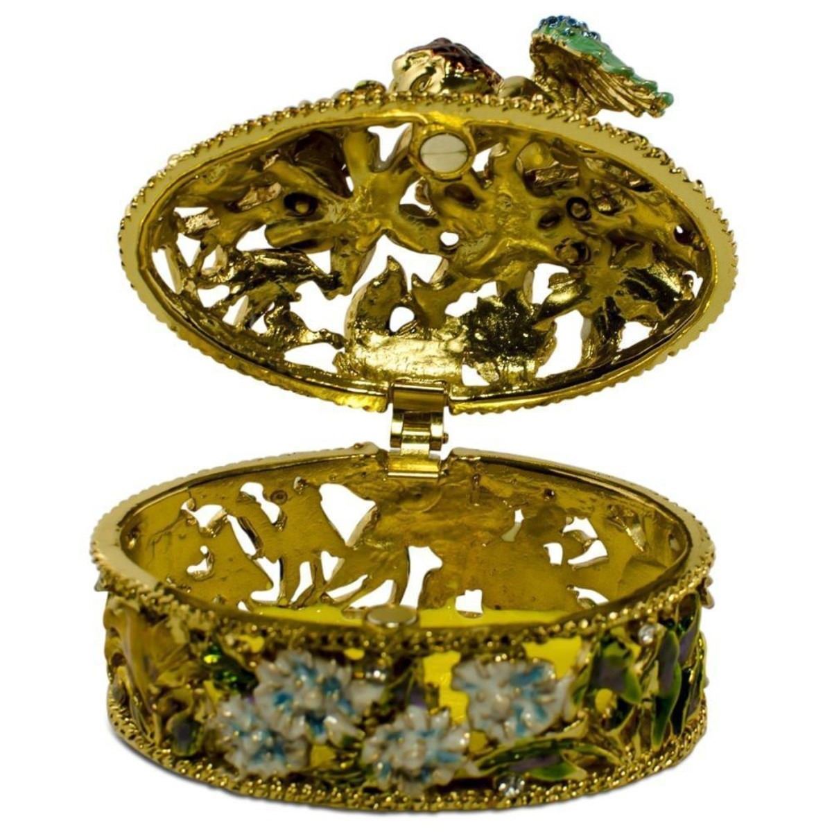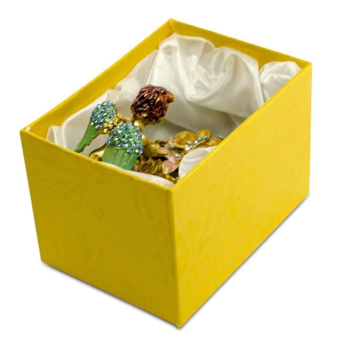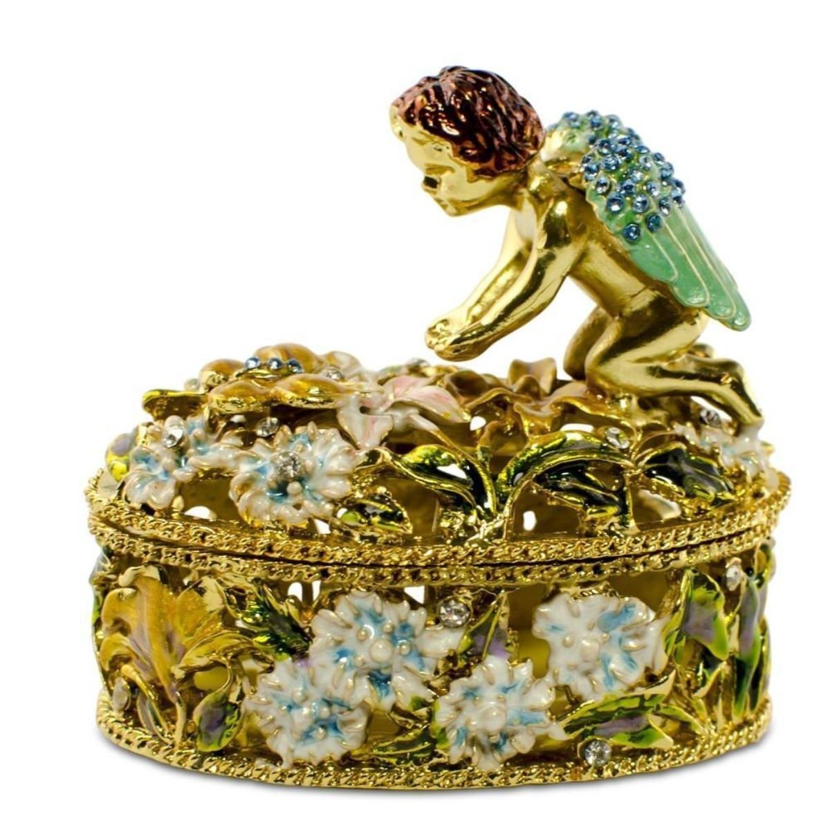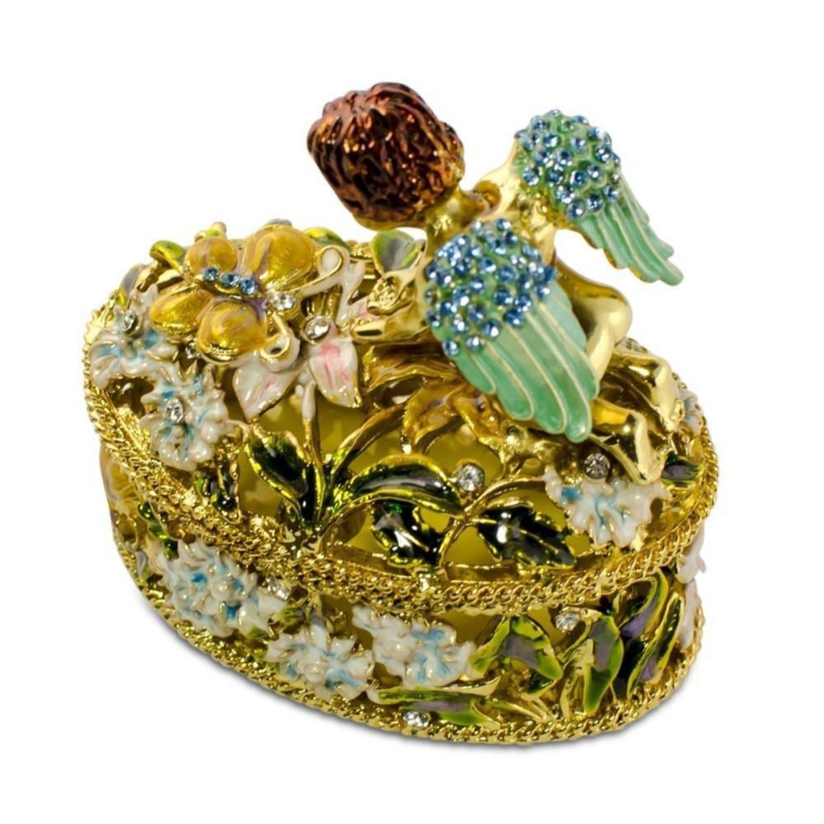 2.75" Crystal Wings Angel with Flowers Rosary Keepsake Box This sparkling trinket box is adorned with clear crystals and high-polished enamel with golden trim. It opens on a hinge and has a magnetic closure to keep the box securely shut. The piece also comes in a beautiful gift box. 2.75" (H) X 2.5" (W) Pewter, Crystals, Enamel Hand Painted Boxed