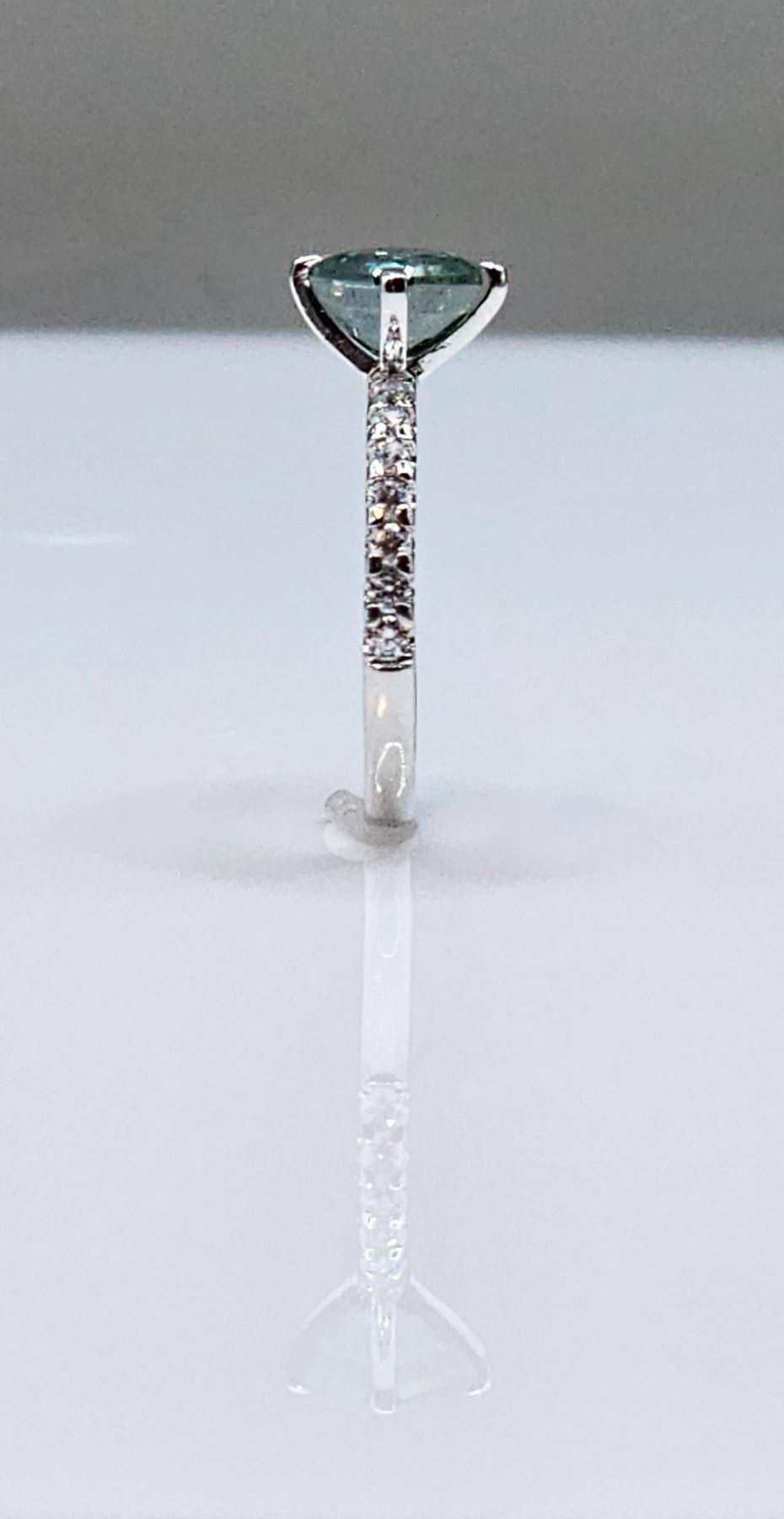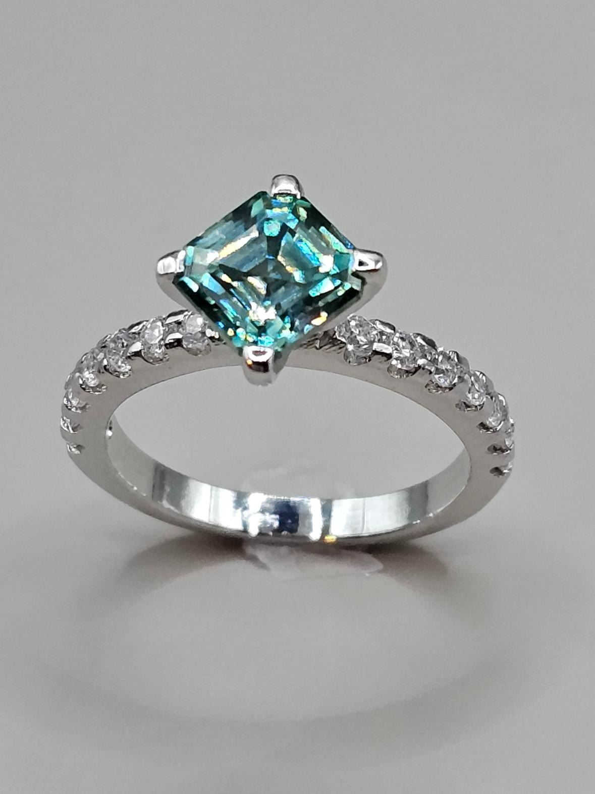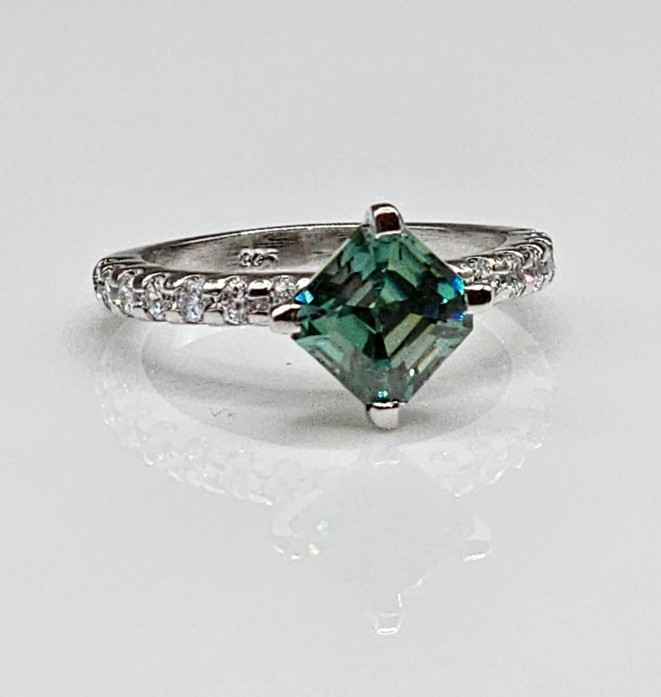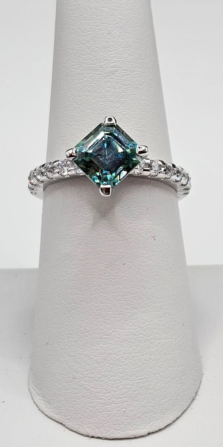 2.75 Ct VVs1 Rare Russian Color Change Lab Created Alexandrite Asscher Cut Ring. This Russian 3.35 Ct Lab Created Color Change Alexandrite is a VVs1 Eye-Clean Fine Asscher Cut Measuring 7.4 x 7.4 mm. The color spectrum ranges from beautiful greens, blues and pink depending on the light and the angle viewed. This spectacular High End Centerstone is Mounted in Tri-Layered 14 Kt White Gold over Solid .925 Sterling Silver with to give the ring its high polish and shine. It measures 8.5 on the Mohs hardness scale. It is also Earth Friendly and Conflict Free. Ring size 7.25. The total weight of this ring is 2.9 grams. The Asscher Cut is often referred to as the "Classic Vintage Contemporary Cut " It is very classy, elegant and it's timeless beauty is just one the reasons it is such a popular, requested, and sought-after Cut. Don't miss this beauty!!!