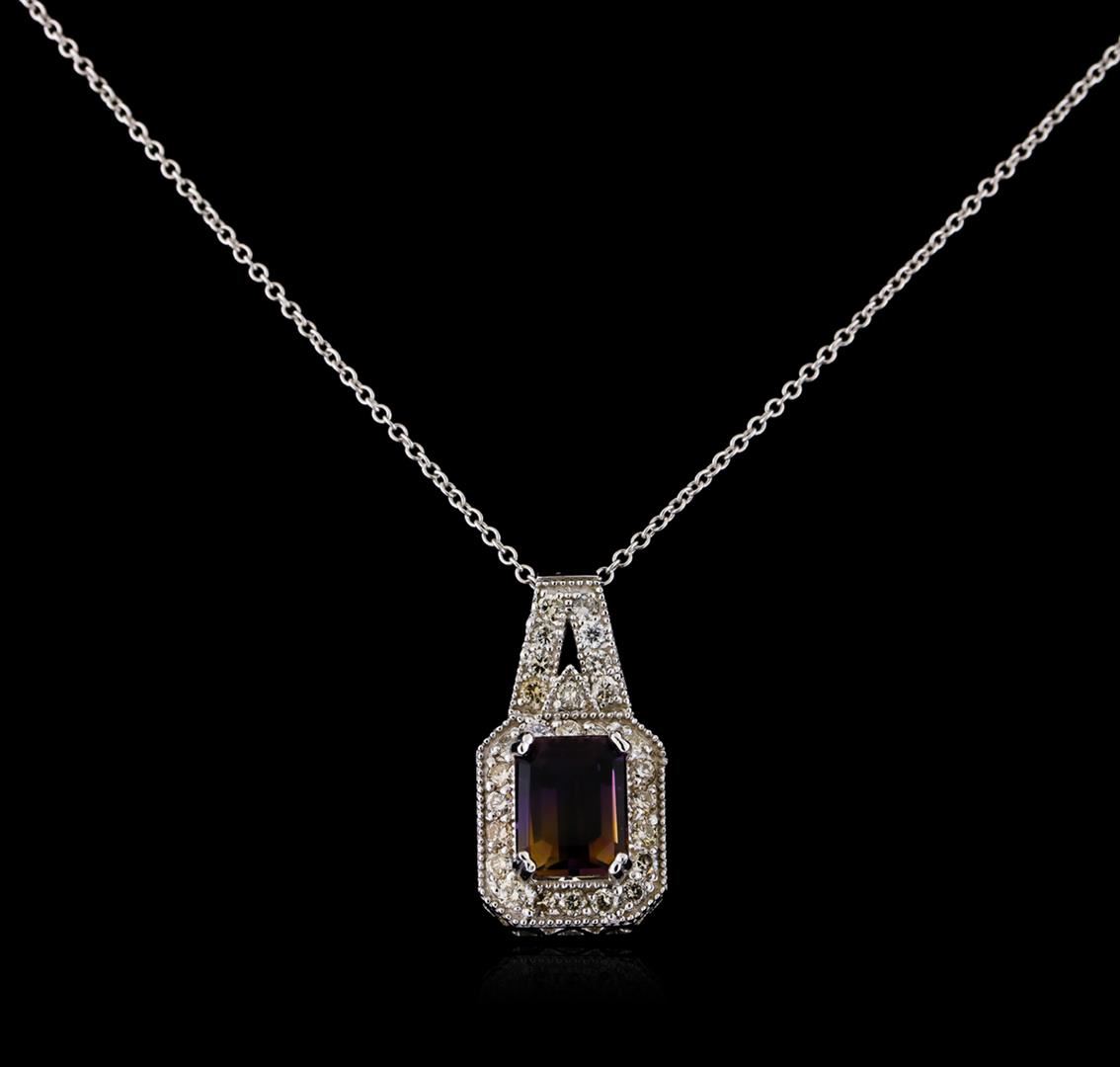 One electronically tested 14KT white gold ladies cast & assembled ametrine and diamond pendant with chain. The featured ametrine is set within a diamond bezel completed by a stylized diamond set hidden bail. The pendant is supported by an eighteen inch length 14KT white gold cable chain, terminating in a lobster claw clasp. Bright polish finish with milgrain detailing. Identified with markings of "K14". Condition is new, good workmanship. Containing: One prong set rectangular step cut natural ametrine quartz, measuring 9.30 x 7.30 x 5.00mm, approximate weight of 2.75ct., clarity is eye clean, type I, medium dark, very slightly grayish, purple color, (GIA P 6/3) to medium dark, slightly brownish, orangy yellow, (GIA oY 6/2), cut is good. Transmitting light with no distortion, transparent. Graded in the setting. Twenty-Seven prong set round brilliant cut diamonds, measuring 1.80 - 1.80 x 1.08mm (depth est.) approximate total weight of 27 Stones = 0.59ct. Graded in the setting. Clarity: SI-1 to SI-2. Color: H - J. Total Weight of Colored Stones 2.75ct. Total Weight of Diamonds 0.59ct. Total Weight of Pendant With Chain 6.08gm. AIG Appraised at $2,840.00.