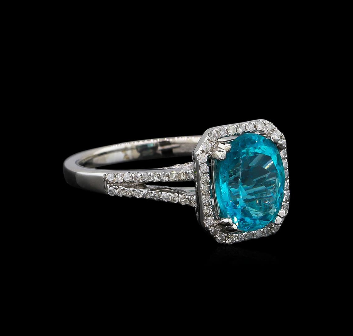 One electronically tested 14KT white gold lady's cast split shank halo ring with a bright polish finish. The featured ladies ring has a shank measuring 2.50 millimeters in width. Trademark is Orianne. Identified with markings of "14K". Condition is new, good workmanship. Containing: One prong set oval modified brilliant cut natural apatite, measuring 9.82 x 7.98 x 5.23mm, approximate weight of 2.75ct., clarity is slightly included, medium, moderately strong, green blue color, (GIA GB 5/4), cut is good. Transmitting light somewhat diffusely, semi-transparent to translucent. Colored gemstones are presumed to have been subjected to commonly used enhancement processes. Graded in the setting. One Hundred Ten prong set round brilliant cut diamonds, measuring 1.10 - 1.00 x 0.66mm (depth est.) approximate total weight of 110 Stones = 0.45ct. Graded in the setting. Clarity: SI-2 to I-1. Color: G - I. Cut Good. Total Weight of Colored Stones 2.75ct. Total Weight of Diamonds 0.45ct. Total Weight of Ring 4.70gm. GAS Appraised at $4,005.00.