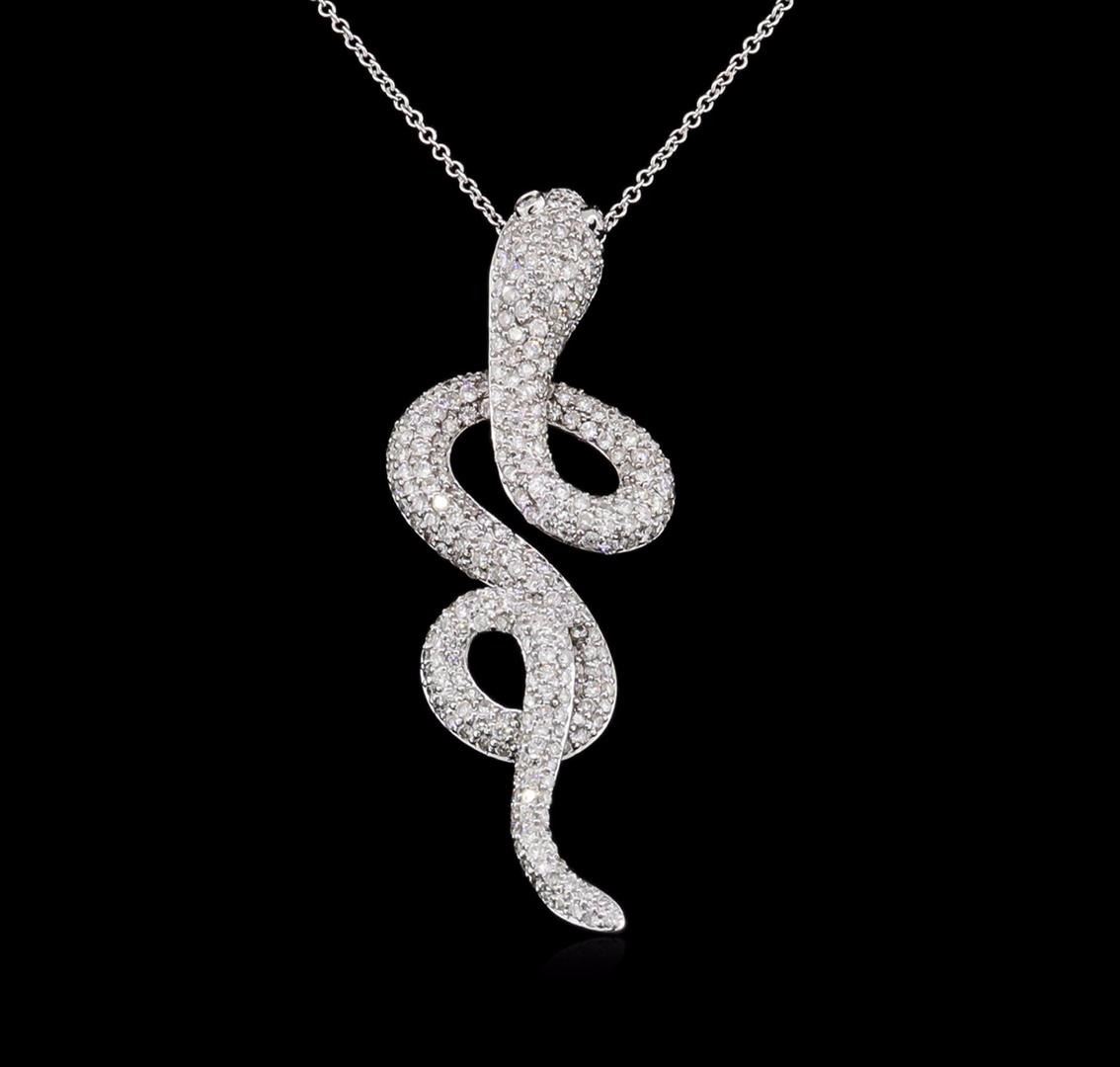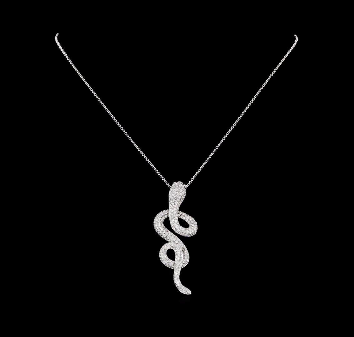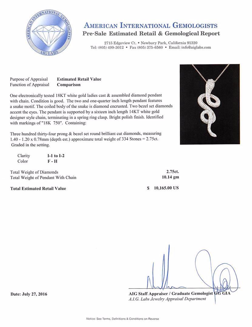 One electronically tested 18KT white gold ladies cast & assembled diamond pendant with chain. The two and one-quarter inch length pendant features a snake motif. The coiled body of the snake is diamond encrusted. Two bezel set diamonds accent the eyes. The pendant is supported by a sixteen inch length 14KT white gold designer style chain, terminating in a spring ring clasp. Bright polish finish. Identified with markings of '18K 750'. Condition is good. Containing: Three Hundred Thirty-Four prong & bezel set round brilliant cut diamonds, measuring 1.40 - 1.20 x 0.78mm (depth est.) approximate total weight of 334 Stones = 2.75ct. Graded in the setting. Clarity I-1 to I-2. Color: F - H. Total Weight of Diamonds 2.75ct.. Total Weight of Pendant With Chain 10.14gm. AIG Appraised at $10,165.00.