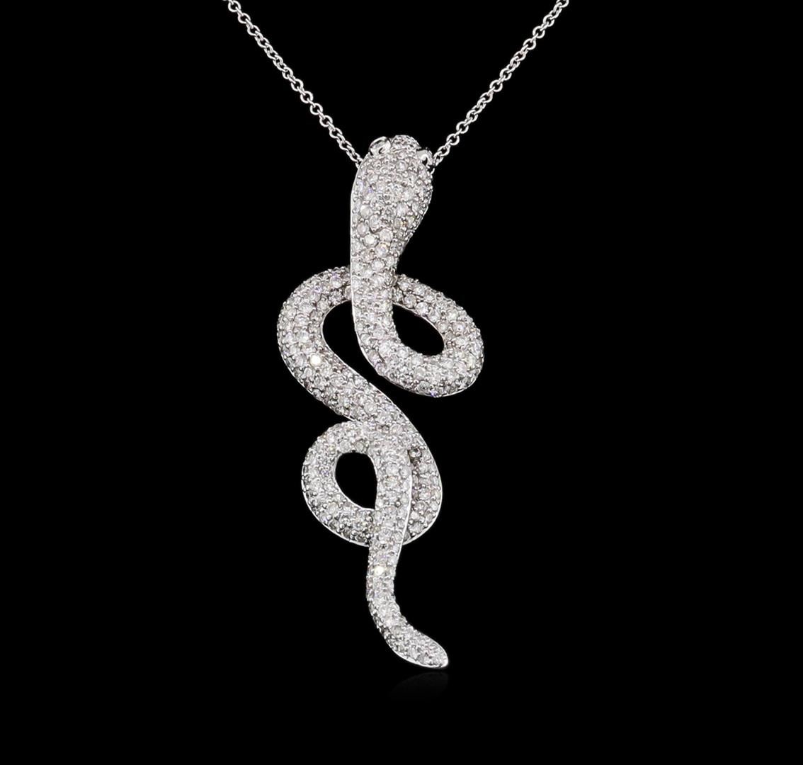 One electronically tested 18KT white gold ladies cast & assembled diamond pendant with chain. The two and one-quarter inch length pendant features a snake motif. The coiled body of the snake is diamond encrusted. Two bezel set diamonds accent the eyes. The pendant is supported by a sixteen inch length 14KT white gold designer style chain, terminating in a spring ring clasp. Bright polish finish. Identified with markings of '18K 750'. Condition is good. Containing: Three Hundred Thirty-Four prong & bezel set round brilliant cut diamonds, measuring 1.40 - 1.20 x 0.78mm (depth est.) approximate total weight of 334 Stones = 2.75ct. Graded in the setting. Clarity I-1 to I-2. Color: F - H. Total Weight of Diamonds 2.75ct.. Total Weight of Pendant With Chain 10.14gm. AIG Appraised at $10,165.00.