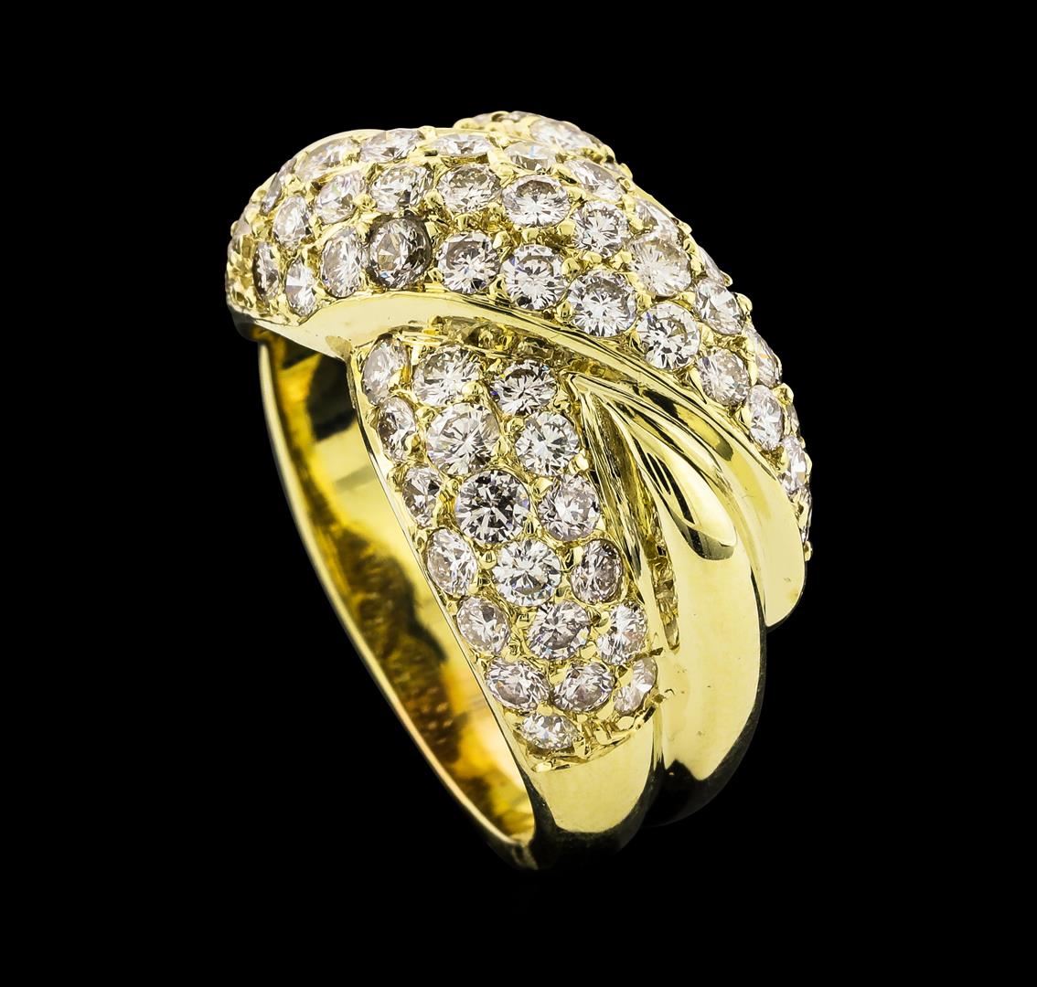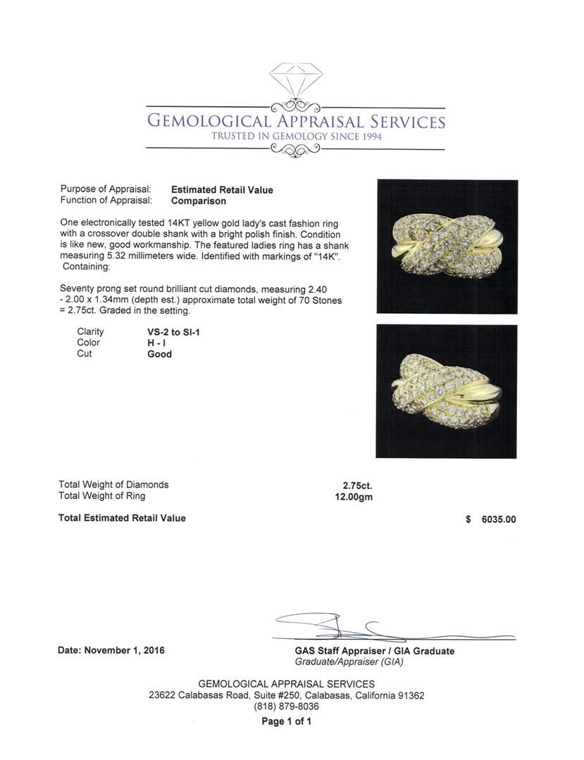 One electronically tested 14KT yellow gold lady's cast fashion ring with a crossover double shank with a bright polish finish. The featured ladies ring has a shank measuring 5.32 millimeters wide. Identified with markings of '14K'. Condition is like new, good workmanship. Containing: Seventy prong set round brilliant cut diamonds, measuring 2.40 - 2.00 x 1.34mm (depth est.) approximate total weight of 70 Stones = 2.75ct. Graded in the setting. Clarity VS-2 to SI-1. Color: H - I Cut Good. Total Weight of Diamonds 2.75ct.. Total Weight of Ring 12.00gm. GAS Appraised at $6,035.00.