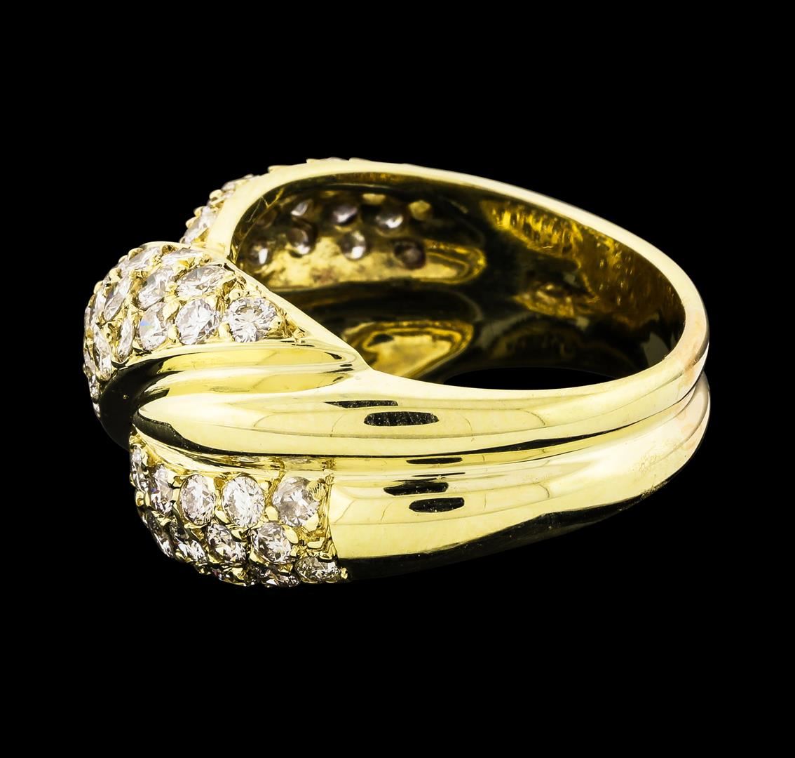 One electronically tested 14KT yellow gold lady's cast fashion ring with a crossover double shank with a bright polish finish. The featured ladies ring has a shank measuring 5.32 millimeters wide. Identified with markings of '14K'. Condition is like new, good workmanship. Containing: Seventy prong set round brilliant cut diamonds, measuring 2.40 - 2.00 x 1.34mm (depth est.) approximate total weight of 70 Stones = 2.75ct. Graded in the setting. Clarity VS-2 to SI-1. Color: H - I Cut Good. Total Weight of Diamonds 2.75ct.. Total Weight of Ring 12.00gm. GAS Appraised at $6,035.00.