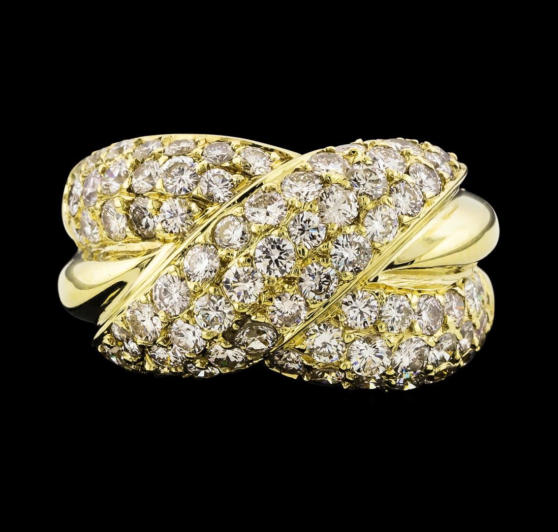 One electronically tested 14KT yellow gold lady's cast fashion ring with a crossover double shank with a bright polish finish. The featured ladies ring has a shank measuring 5.32 millimeters wide. Identified with markings of '14K'. Condition is like new, good workmanship. Containing: Seventy prong set round brilliant cut diamonds, measuring 2.40 - 2.00 x 1.34mm (depth est.) approximate total weight of 70 Stones = 2.75ct. Graded in the setting. Clarity VS-2 to SI-1. Color: H - I Cut Good. Total Weight of Diamonds 2.75ct.. Total Weight of Ring 12.00gm. GAS Appraised at $6,035.00.