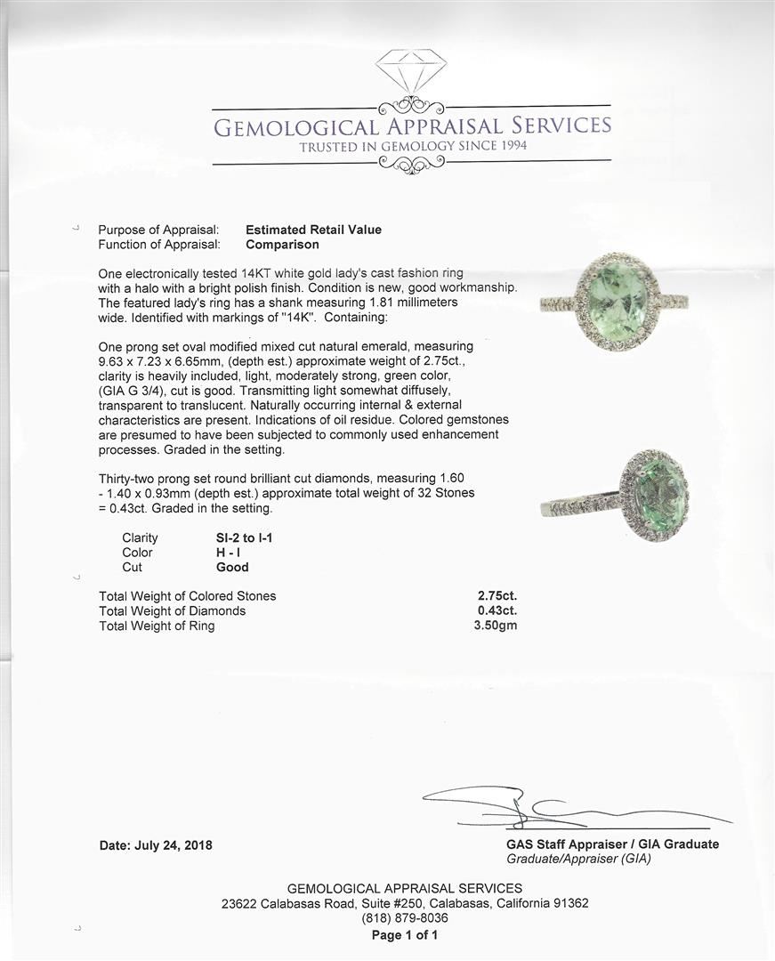 One electronically tested 14KT white gold lady's cast fashion ring with a halo with a bright polish finish. Condition is new, good workmanship. The featured lady's ring has a shank measuring 1.81 millimeters wide. Identified with markings of "14k". One pring set oval modified mixed cut natural emerald, measuring 9.63 x 7.23 x 6.65mm, approximate weight of 2.75 ct., clarity is heavily included, light, moderately strong, green color, (GIA G 3/4), cut is good. GAS Appraised.
