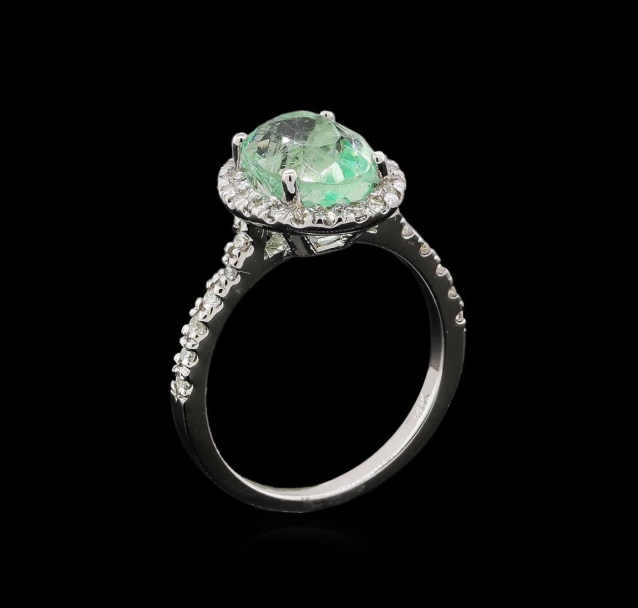One electronically tested 14KT white gold lady's cast fashion ring with a halo with a bright polish finish. Condition is new, good workmanship. The featured lady's ring has a shank measuring 1.81 millimeters wide. Identified with markings of "14k". One pring set oval modified mixed cut natural emerald, measuring 9.63 x 7.23 x 6.65mm, approximate weight of 2.75 ct., clarity is heavily included, light, moderately strong, green color, (GIA G 3/4), cut is good. GAS Appraised.