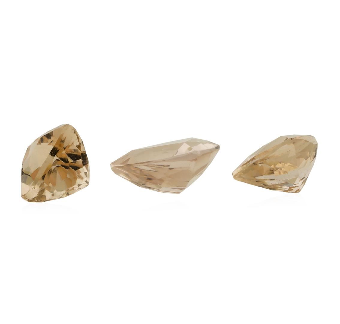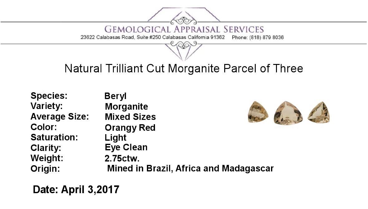 One natural trilliant cut morganite parcel of three with an exact weight of 2.75ctw., clarity is eye clean, orangy red, light. Gemological Appraisals Services estimates the retail value at $687.5 GAS Appraised.