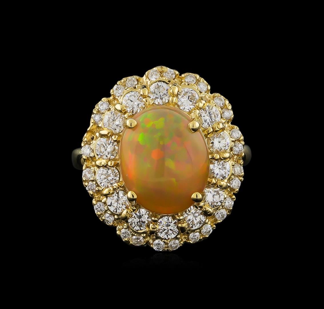One electronically tested 14KT yellow gold lady's cast fashion ring with a scalloped double basket halo with a bright polish finish. The featured lady's ring has a shank measuring 2.17 millimeters wide. Identified with markings of "14K". Condition is new, good workmanship. Containing: One orange opal that is cut in a oval shaped cabochon and is prong set, measuring 11.99 mm long x 9.90 mm wide, and 4.70 mm thick and the approximate weight is 2.75 carats. The opal has a bright, orange-red play of color (fire) in a rolling flashfire pattern; a medium dome; a good cut; no inclusions; consistent in its brightness and pattern; and is not directional. Graded in the setting. Fourteen prong set round brilliant cut diamonds, measuring 2.75 - 2.65 x 1.67mm (depth est.) approximate total weight of 14 Stones = 1.05ct. Graded in the setting. Clarity: SI-1 to SI-2. Color: H - I. Cut Very Good Twenty-Eight prong set round brilliant cut diamonds, measuring 1.40 - 1.30 x 0.84mm (depth est.) approximate total weight of 28 Stones = 0.26ct. Graded in the setting. Clarity: SI-1 to I-1. Color: H - I. Cut Good. Total Weight of Diamonds 1.31ct. Total Weight of Opals 2.75ct. Total Weight of Ring 7.70gm. GAS Appraised at $5,280.00.