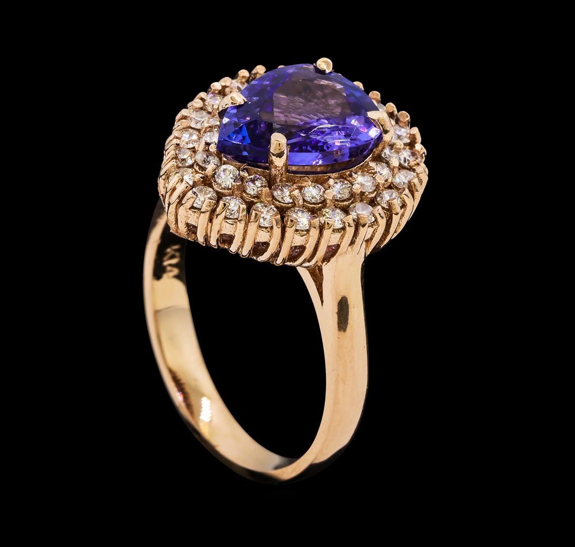 One electronically tested 14KT rose gold lady's cast fashion ring with a double basket halo with a bright polish finish. The featured lady's ring has a shank measuring 2.75 millimeters wide. Identified with markings of 'K14'. Condition is new, good workmanship. Containing: One prong set pear modified brilliant cut natural tanzanite, measuring 11.10 x 7.75 x 4.18mm, (depth est.) 12%. bulge factor, approximate weight of 2.75ct., clarity is eye clean, medium, moderately strong, violetish blue color, (GIA vB 5/4), cut is very good. Transmitting light with no distortion, transparent. Colored gemstones are presumed to have been subjected to commonly used enhancement processes. Graded in the setting. Twenty prong set round brilliant cut diamonds, measuring 1.80 - 1.70 x 1.09mm (depth est.) approximate total weight of 20 Stones = 0.40ct. Graded in the setting. Clarity VS-2 to SI-2. Color: H - I Cut Good Nineteen prong set round brilliant cut diamonds, measuring 1.60 - 1.55 x 0.98mm (depth est.) approximate total weight of 19 Stones = 0.28ct. Graded in the setting. Clarity SI-1 to SI-2. Color: H - I Cut Good. Total Weight of Colored Stones 2.75ct.. Total Weight of Diamonds 0.68ct.. Total Weight of Ring 6.50gm. GAS Appraised at $6,735.00.