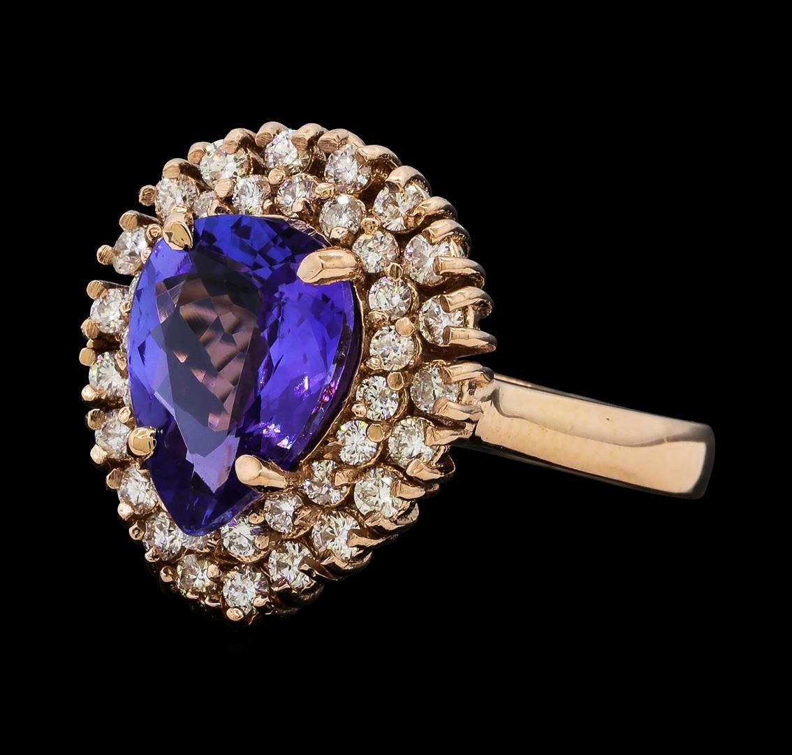 One electronically tested 14KT rose gold lady's cast fashion ring with a double basket halo with a bright polish finish. The featured lady's ring has a shank measuring 2.75 millimeters wide. Identified with markings of 'K14'. Condition is new, good workmanship. Containing: One prong set pear modified brilliant cut natural tanzanite, measuring 11.10 x 7.75 x 4.18mm, (depth est.) 12%. bulge factor, approximate weight of 2.75ct., clarity is eye clean, medium, moderately strong, violetish blue color, (GIA vB 5/4), cut is very good. Transmitting light with no distortion, transparent. Colored gemstones are presumed to have been subjected to commonly used enhancement processes. Graded in the setting. Twenty prong set round brilliant cut diamonds, measuring 1.80 - 1.70 x 1.09mm (depth est.) approximate total weight of 20 Stones = 0.40ct. Graded in the setting. Clarity VS-2 to SI-2. Color: H - I Cut Good Nineteen prong set round brilliant cut diamonds, measuring 1.60 - 1.55 x 0.98mm (depth est.) approximate total weight of 19 Stones = 0.28ct. Graded in the setting. Clarity SI-1 to SI-2. Color: H - I Cut Good. Total Weight of Colored Stones 2.75ct.. Total Weight of Diamonds 0.68ct.. Total Weight of Ring 6.50gm. GAS Appraised at $6,735.00.