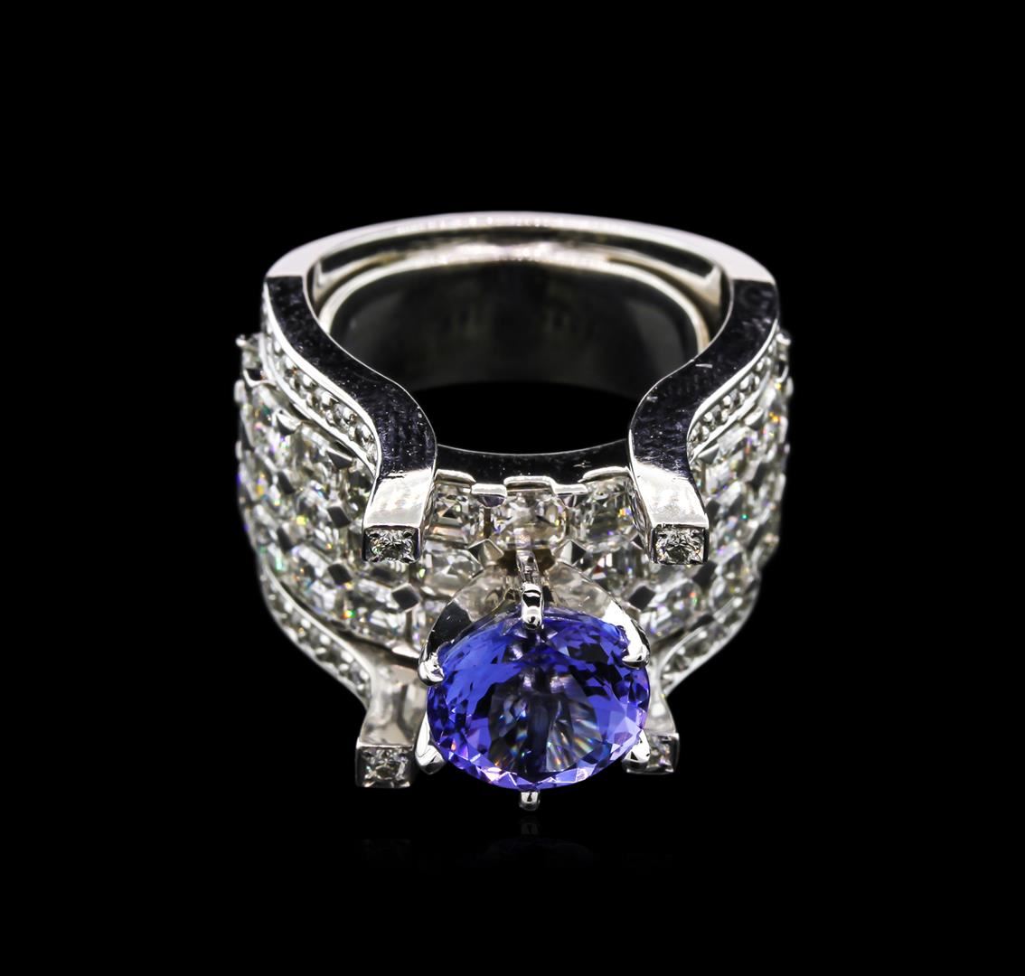 One electronically tested 14KT white gold lady's combination cast & assembled fashion ring with a bright polish finish. The featured lady's ring has a five diamond row wide band motif measuring 14 millimeters wide with a shank measuring 8.65 millimeters in width. The featured lady's ring also has a wing-guard soldered to the inside shank for adjustable sizing. Condition is new, good workmanship. Containing: One prong set round modified brilliant cut natural tanzanite, measuring 8.60 - 8.57 x 5.58 mm, approximate weight of 2.75ct., clarity is eye clean, type I, medium, very slightly grayish, bluish violet color, (GIA bV 5/3), cut is very good. Transmitting light with no distortion, transparent. Colored gemstones are presumed to have been subjected to commonly used enhancement processes. Graded in the setting. Thirty-Two prong set square emerald cut diamonds, measuring 3.00 x 2.90 x 1.80mm (depth est.) approximate total weight of 32 Stones = 4.00ct. Graded in the setting. Clarity: VS-1 to VS-2. Color: G - I. Cut Very Good Forty-Eight bead set round brilliant cut diamonds, measuring 1.30 - 1.20 x 0.81mm (depth est.) approximate total weight of 48 Stones = 0.37ct. Graded in the setting. Clarity: SI-1 to SI-2. Color: G - Good Four prong set round brilliant cut diamonds, measuring 1.60 - 1.50 x 0.93mm (depth est.) approximate total weight of 4 Stones = 0.05ct. Graded in the setting. Clarity: VS-2 to SI-1. Color: G - Good. Total Weight of Colored Stones 2.75ct. Total Weight of Diamonds 4.42ct. Total Weight of Ring 19.80gm. GAS Appraised at $14,550.00.