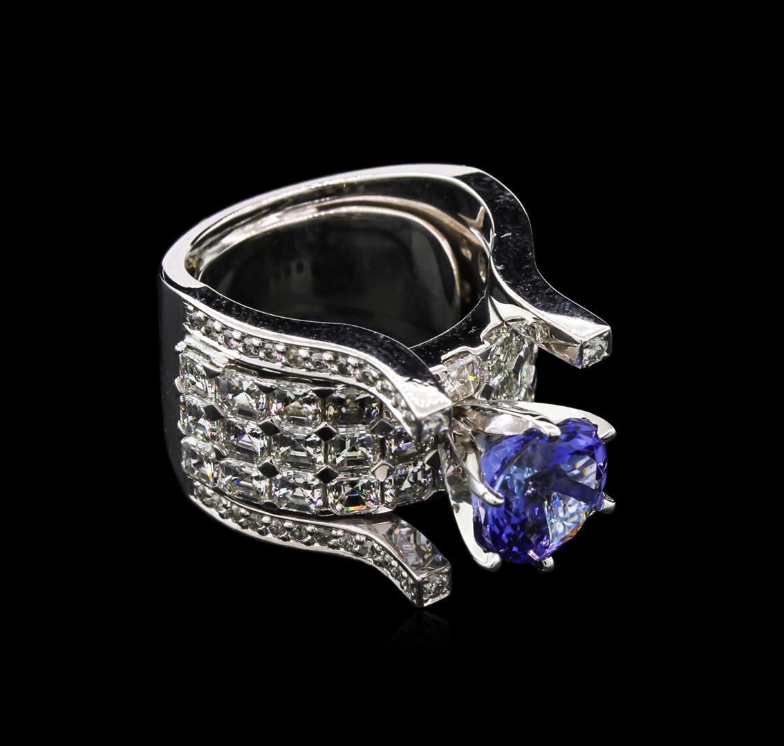 One electronically tested 14KT white gold lady's combination cast & assembled fashion ring with a bright polish finish. The featured lady's ring has a five diamond row wide band motif measuring 14 millimeters wide with a shank measuring 8.65 millimeters in width. The featured lady's ring also has a wing-guard soldered to the inside shank for adjustable sizing. Condition is new, good workmanship. Containing: One prong set round modified brilliant cut natural tanzanite, measuring 8.60 - 8.57 x 5.58 mm, approximate weight of 2.75ct., clarity is eye clean, type I, medium, very slightly grayish, bluish violet color, (GIA bV 5/3), cut is very good. Transmitting light with no distortion, transparent. Colored gemstones are presumed to have been subjected to commonly used enhancement processes. Graded in the setting. Thirty-Two prong set square emerald cut diamonds, measuring 3.00 x 2.90 x 1.80mm (depth est.) approximate total weight of 32 Stones = 4.00ct. Graded in the setting. Clarity: VS-1 to VS-2. Color: G - I. Cut Very Good Forty-Eight bead set round brilliant cut diamonds, measuring 1.30 - 1.20 x 0.81mm (depth est.) approximate total weight of 48 Stones = 0.37ct. Graded in the setting. Clarity: SI-1 to SI-2. Color: G - Good Four prong set round brilliant cut diamonds, measuring 1.60 - 1.50 x 0.93mm (depth est.) approximate total weight of 4 Stones = 0.05ct. Graded in the setting. Clarity: VS-2 to SI-1. Color: G - Good. Total Weight of Colored Stones 2.75ct. Total Weight of Diamonds 4.42ct. Total Weight of Ring 19.80gm. GAS Appraised at $14,550.00.