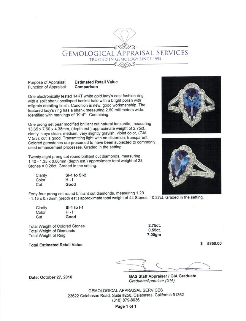 One electronically tested 14KT white gold lady's cast fashion ring with a split shank scalloped basket halo with a bright polish with milgrain detailing finish. The featured lady's ring has a shank measuring 2.60 millimeters wide. Identified with markings of 'K14'. Condition is new, good workmanship. Containing: One prong set pear modified brilliant cut natural tanzanite, measuring 13.65 x 7.60 x 4.38mm, (depth est.) approximate weight of 2.75ct., clarity is eye clean, medium, very slightly grayish, violet color, (GIA V 5/3), cut is good. Transmitting light with no distortion, transparent. Colored gemstones are presumed to have been subjected to commonly used enhancement processes. Graded in the setting. Twenty-Eight prong set round brilliant cut diamonds, measuring 1.40 - 1.35 x 0.86mm (depth est.) approximate total weight of 28 Stones = 0.28ct. Graded in the setting. Clarity SI-1 to SI-2. Color: H - I Cut Good Forty-Four prong set round brilliant cut diamonds, measuring 1.20 - 1.15 x 0.73mm (depth est.) approximate total weight of 44 Stones = 0.27ct. Graded in the setting. Clarity SI-1 to I-1. Color: H - I Cut Good. Total Weight of Colored Stones 2.75ct.. Total Weight of Diamonds 0.55ct.. Total Weight of Ring 7.00gm. GAS Appraised at $5,850.00.